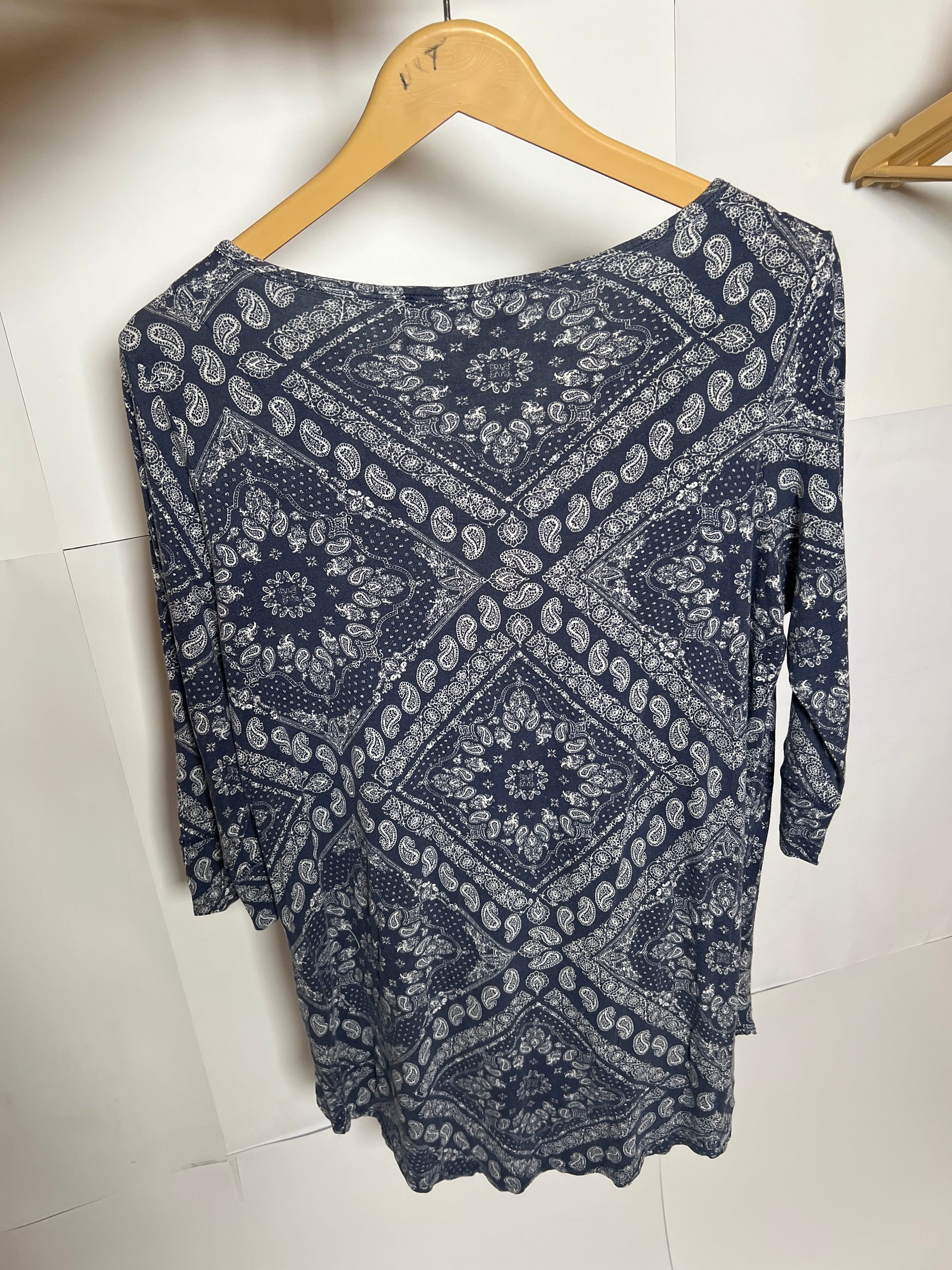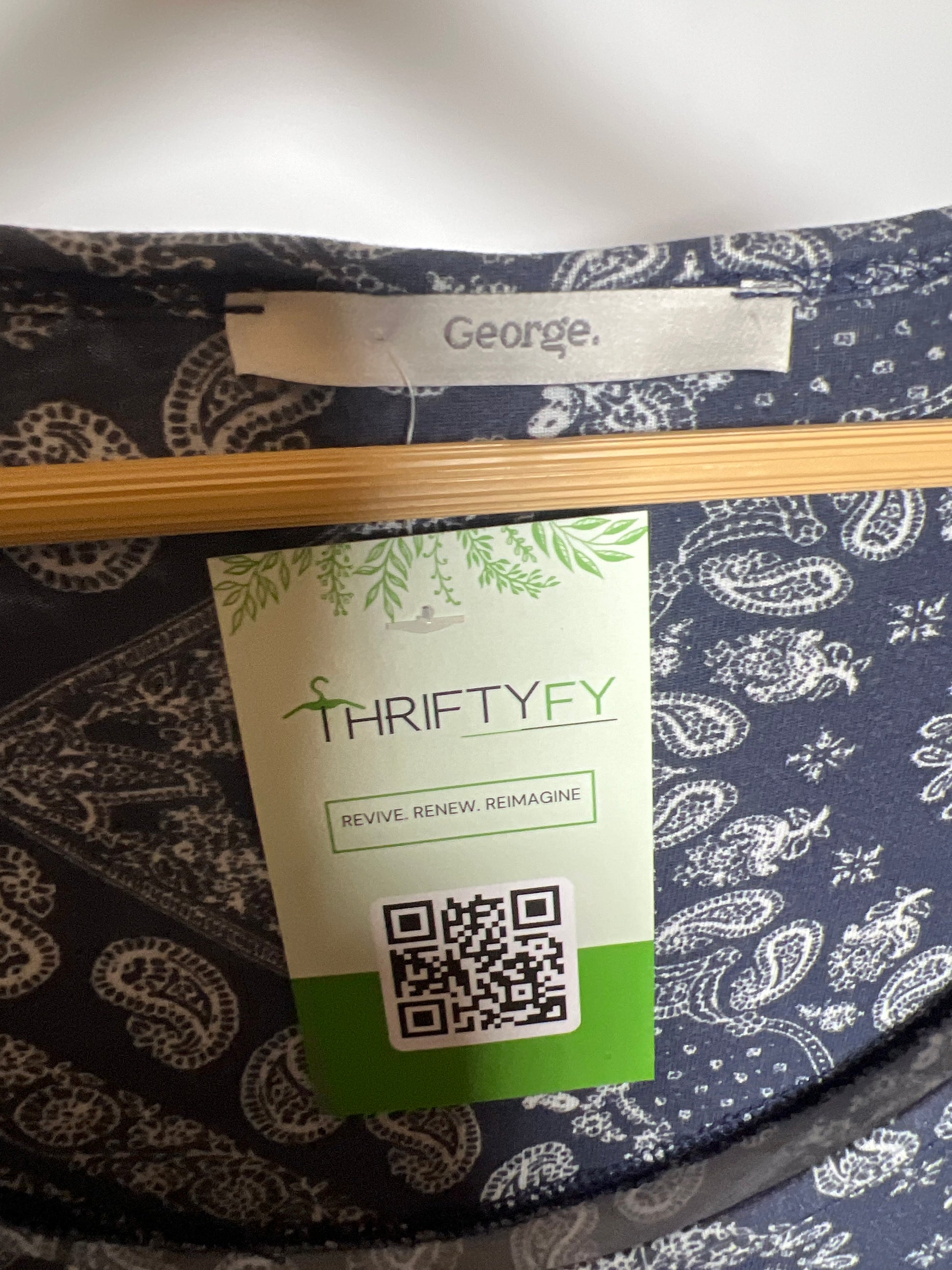 This dress from George features a blue fabric with white roses, available in a small size. It has a chest measurement of 19 inches and a length of 34 inches, in excellent condition.