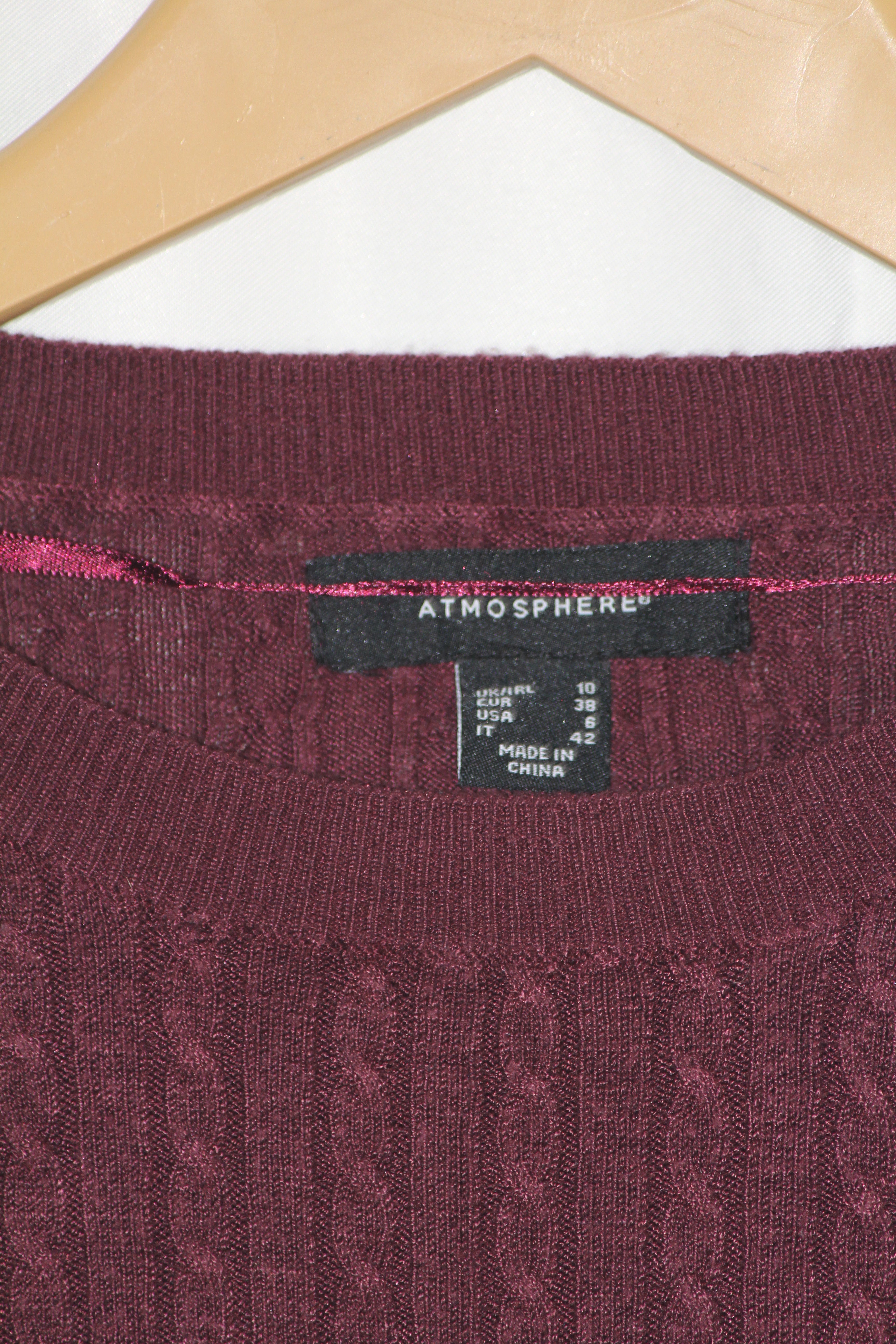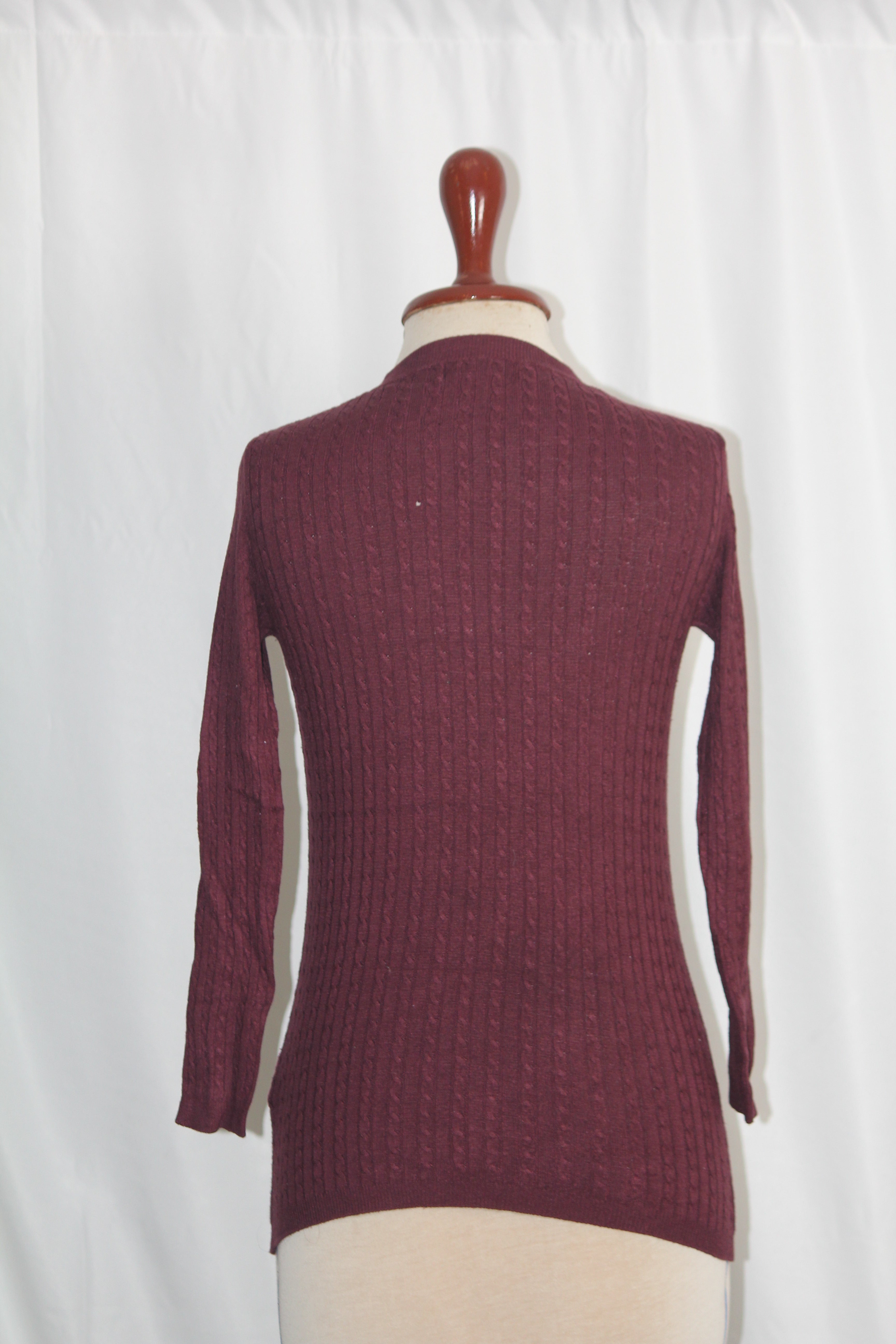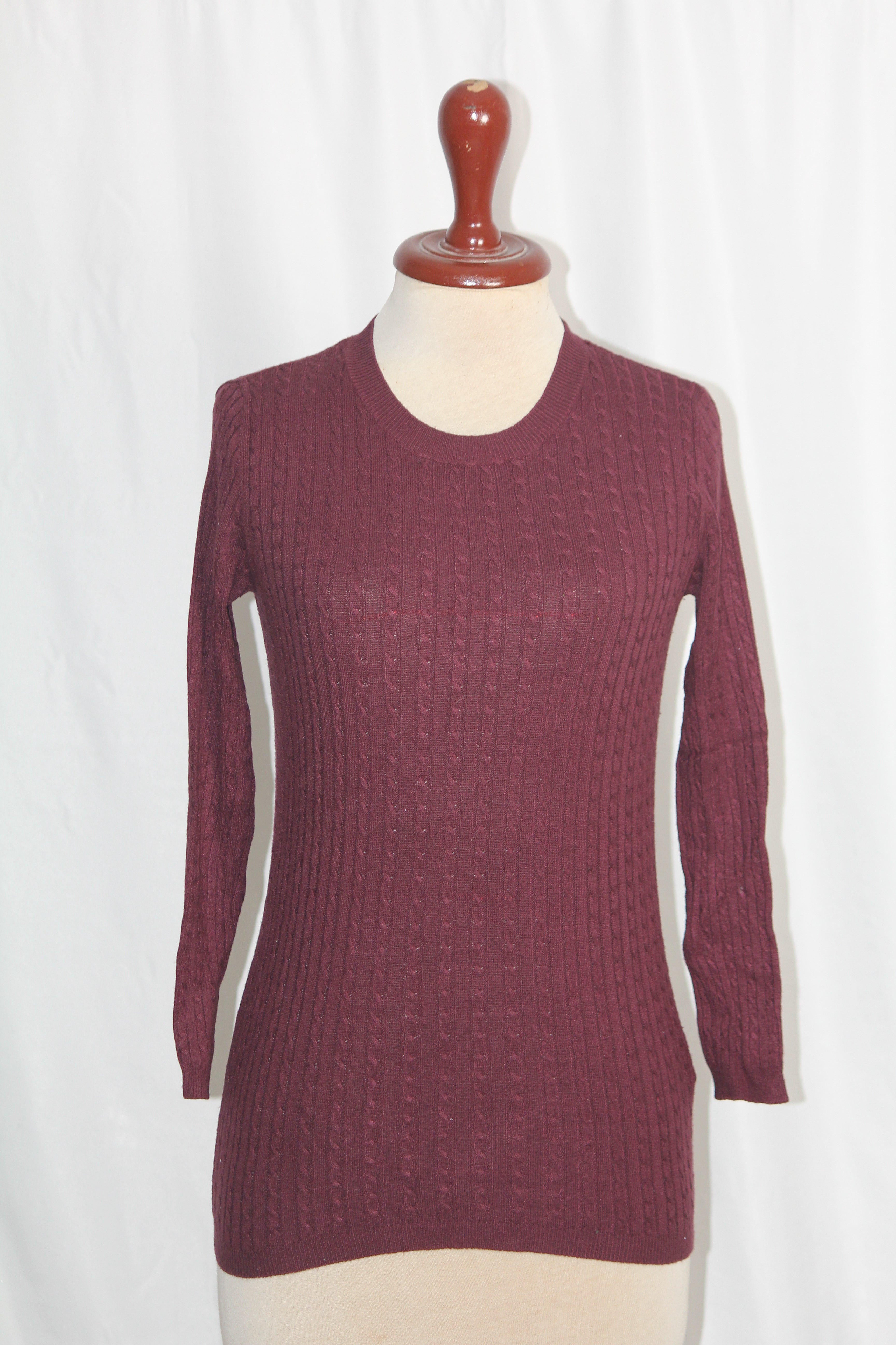 This rich maroon Atmosphere blouse is perfect for winter layering. Small size, 16" bust, and 20" length, in excellent condition.