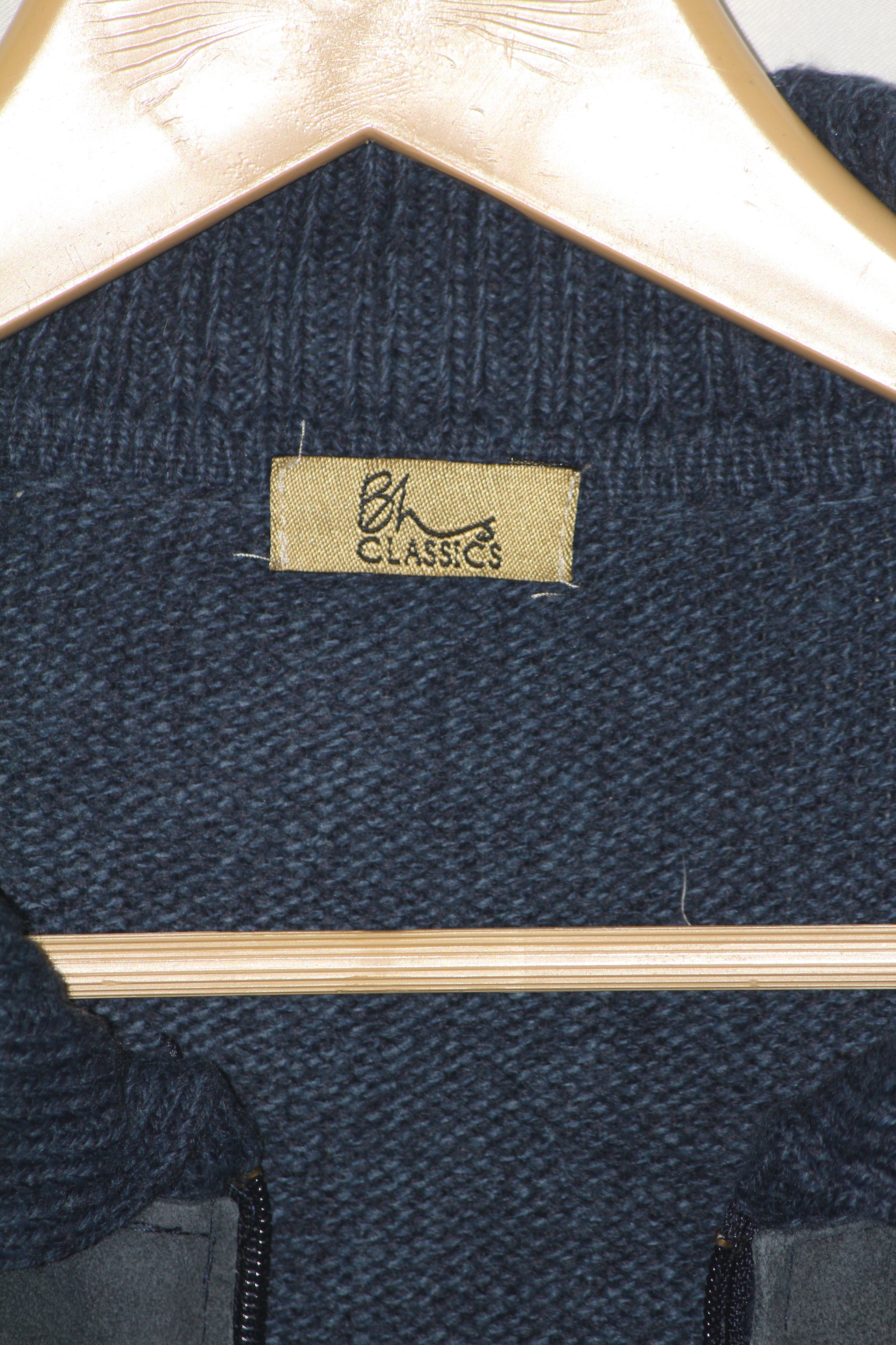 Full sleeve navy blue zipper sweater by BHS, classic acrylic knit. Measurements: Chest 25"