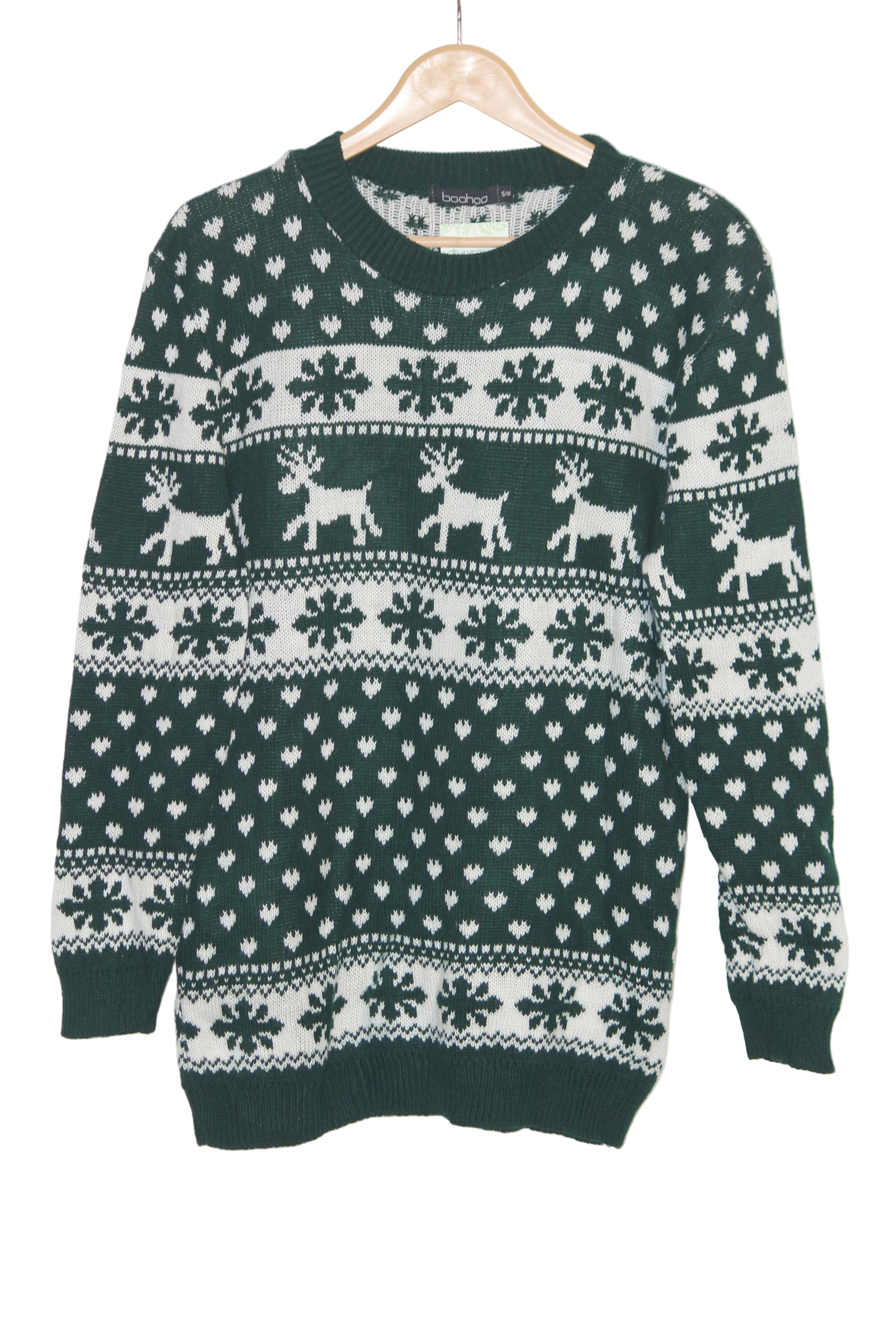 Trendy green and white embroidered sweater by Boohoo made from acrylic fabric, offering warmth with a stylish modern look.