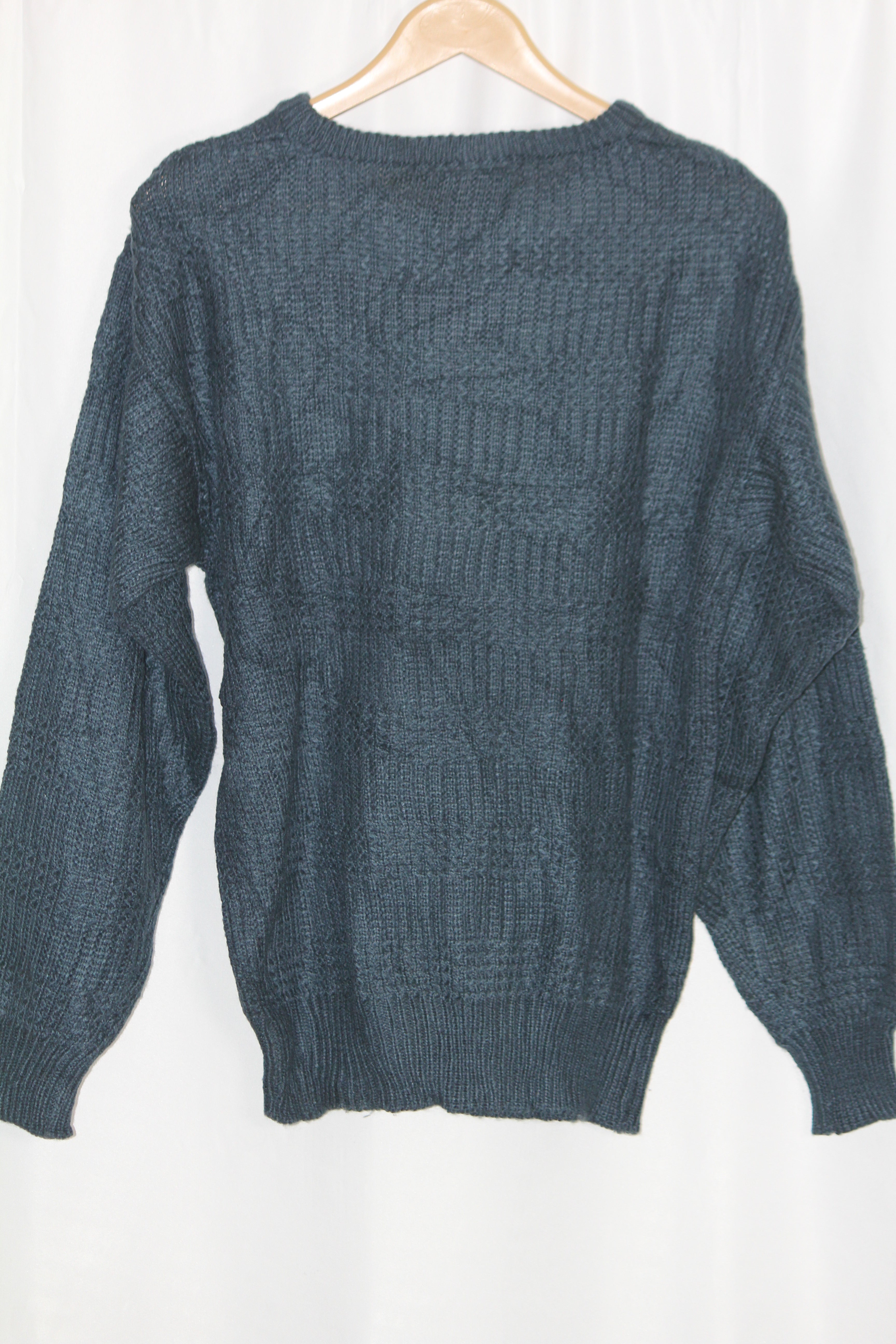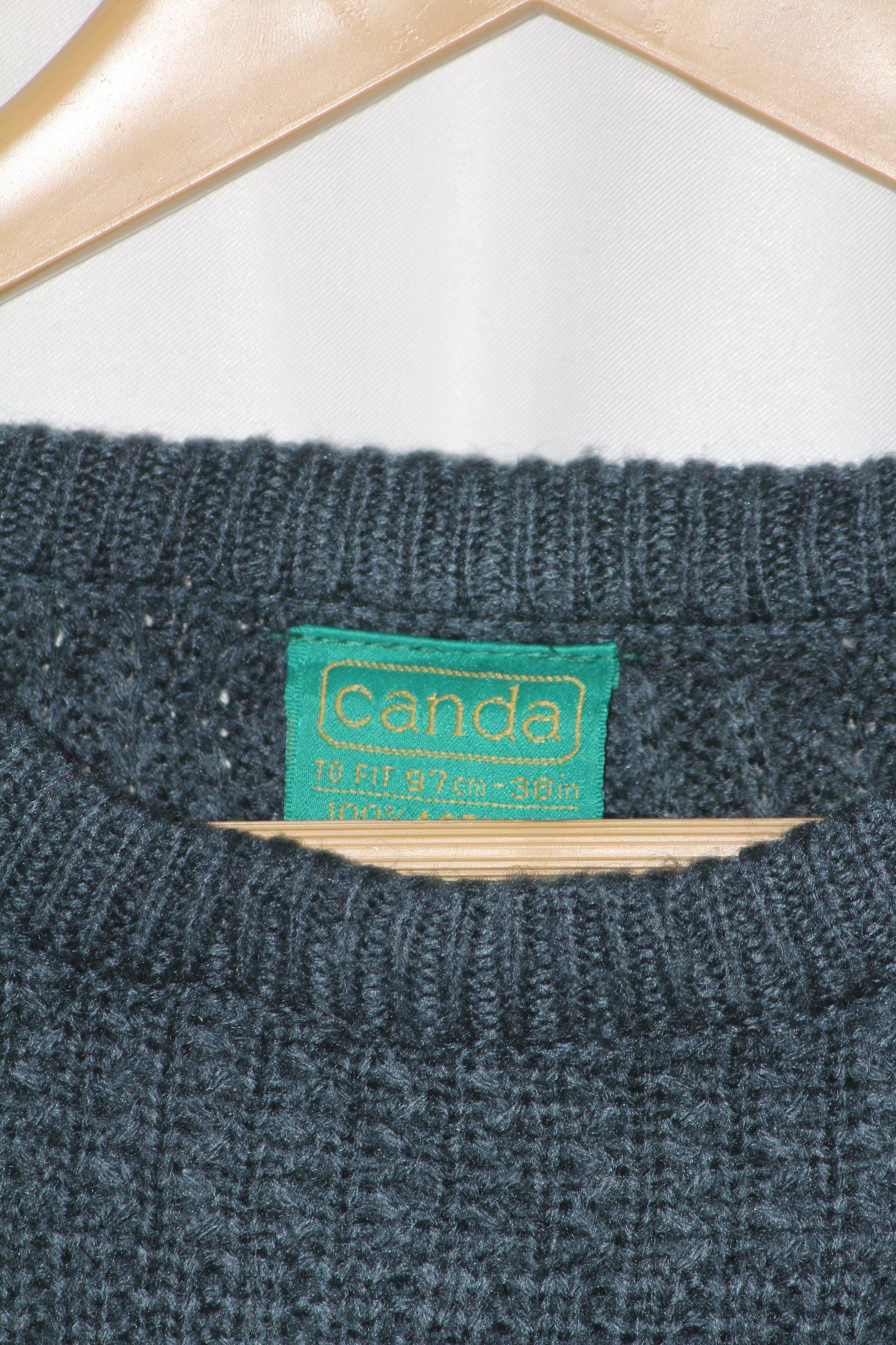 Blue full sleeve sweater by Canda. Classic knit style. Chest 22.5", Length 28", Sleeve 23". Fabric: 100% Acrylic.