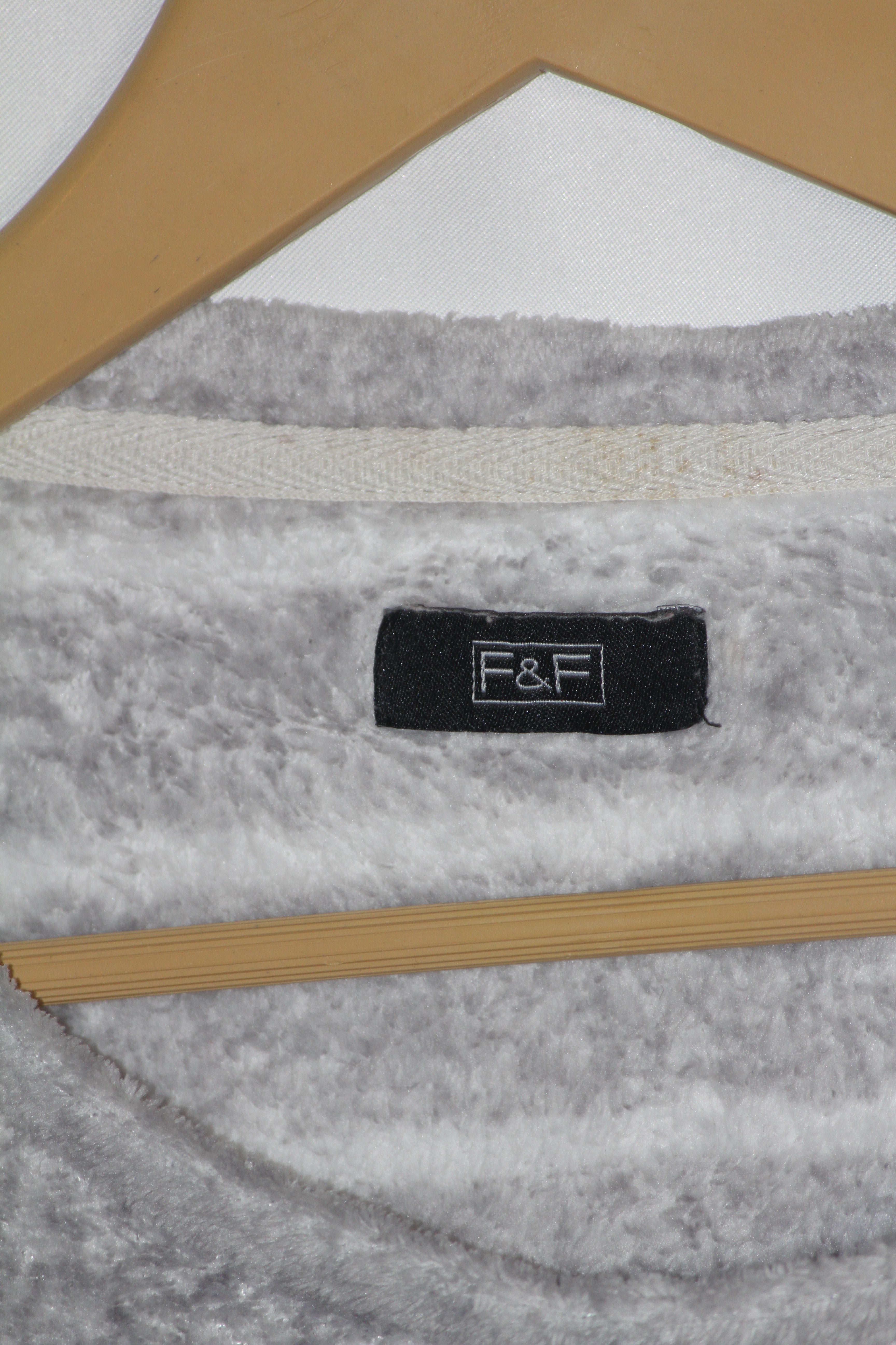 Grey warm sweater by F&F with white horizontal stripes, a stylish winter wardrobe essential.