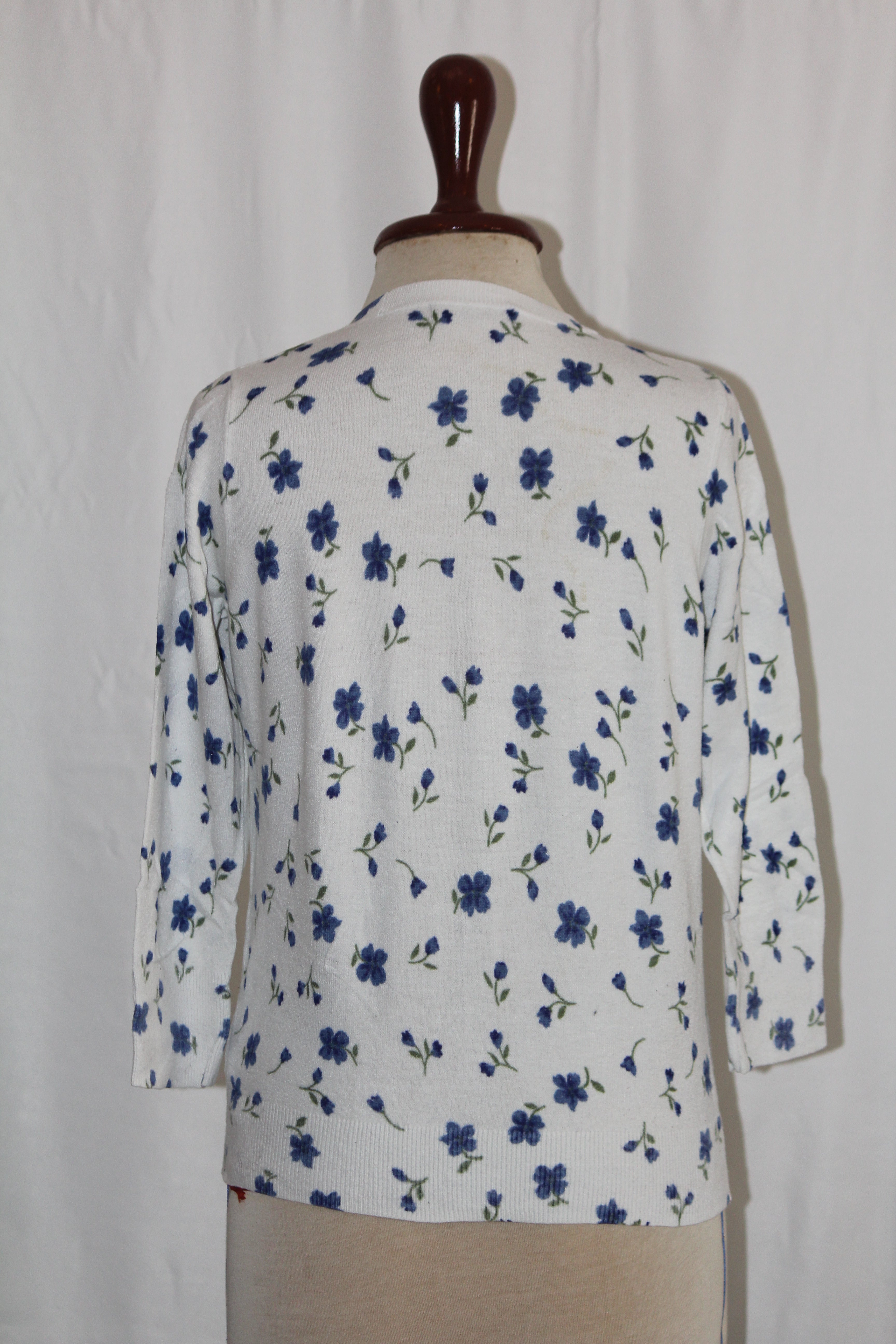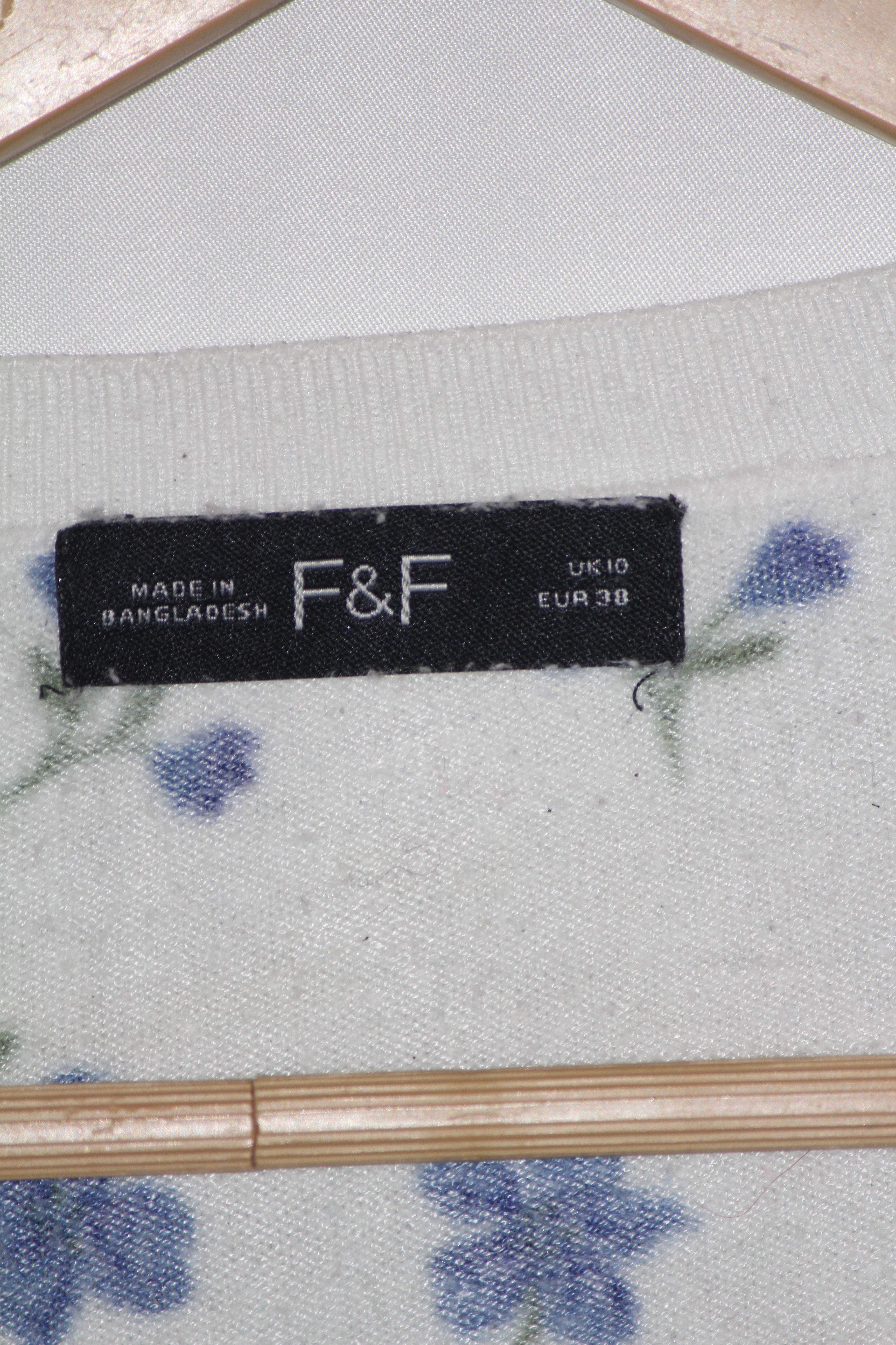 Add a touch of elegance with the F&F White Sweater. Small-sized and featuring blue floral designs, it’s a charming piece for any occasion.