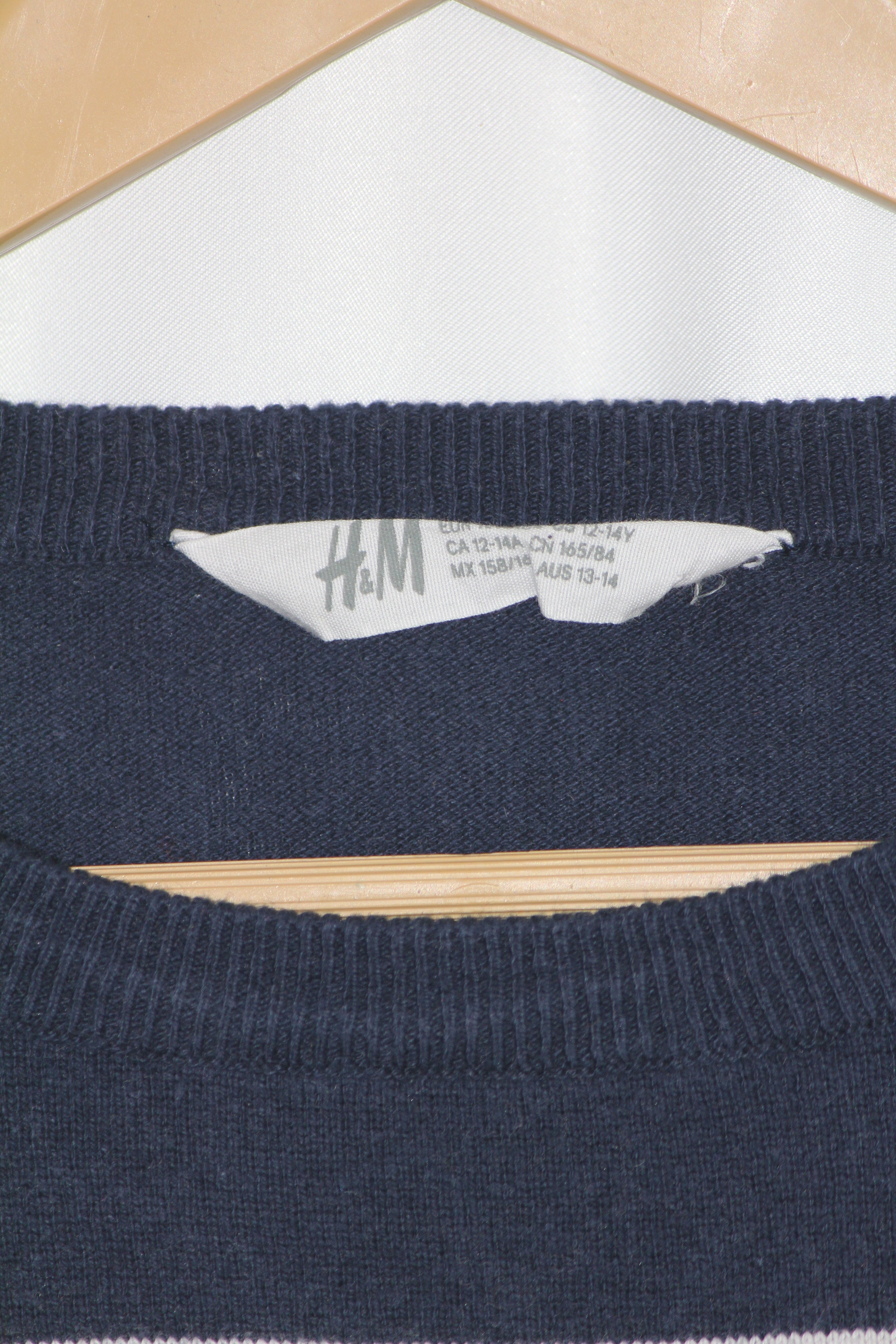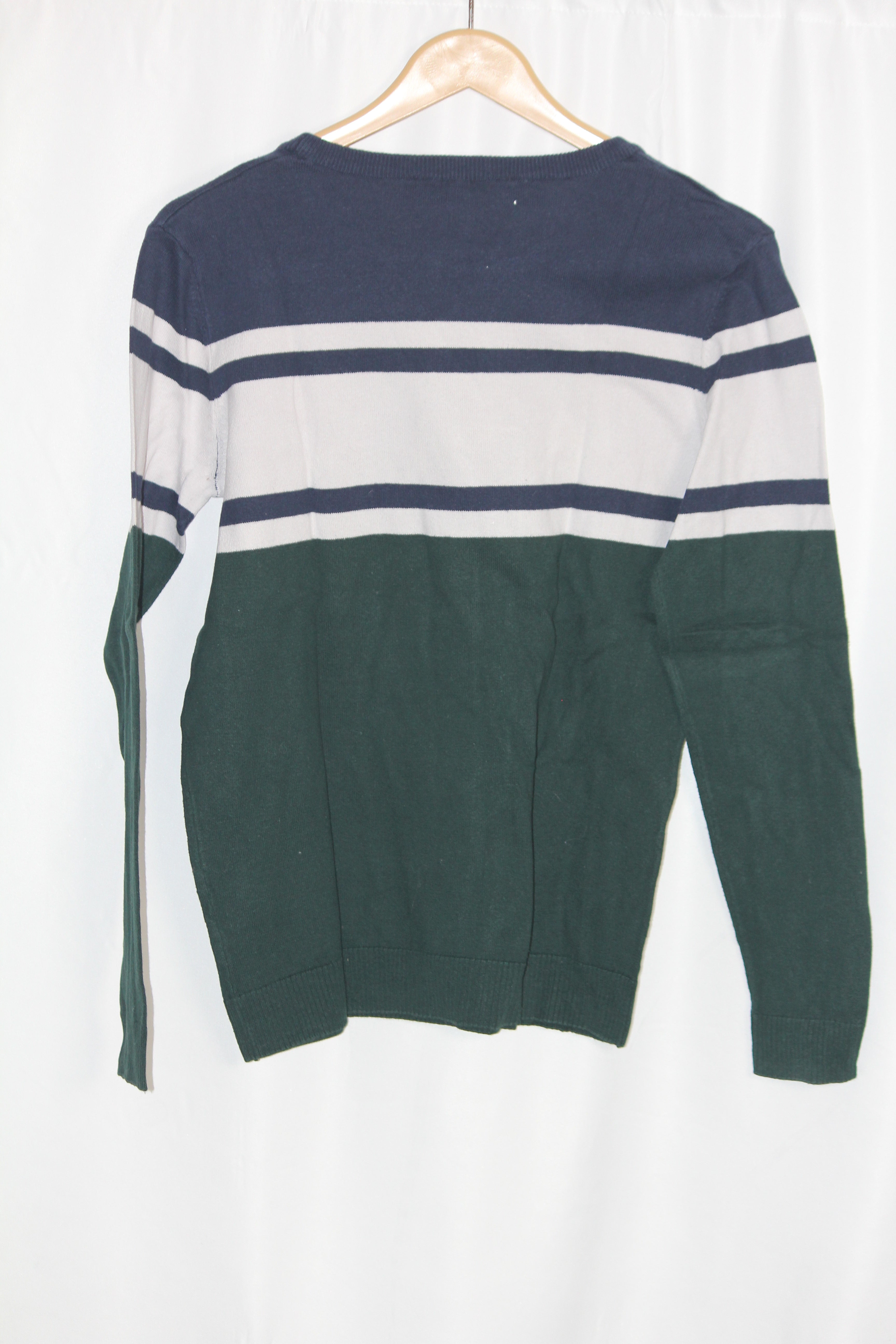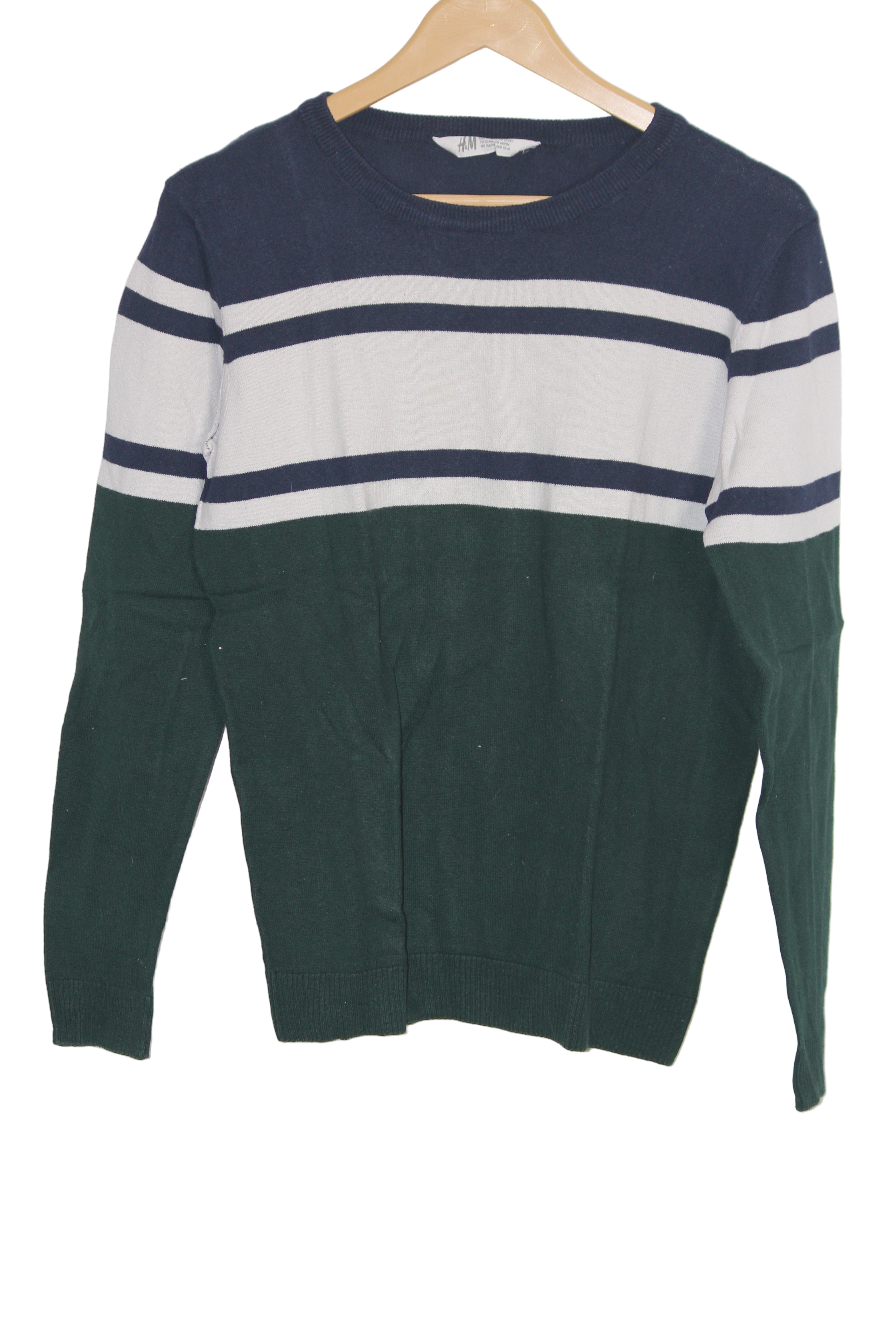 Stylish full sleeves green sweater with white upper stripes by H&M. Chest: 20.5", Length: 25.5", Sleeve: 24". Made from 100% cotton, breathable and comfy.