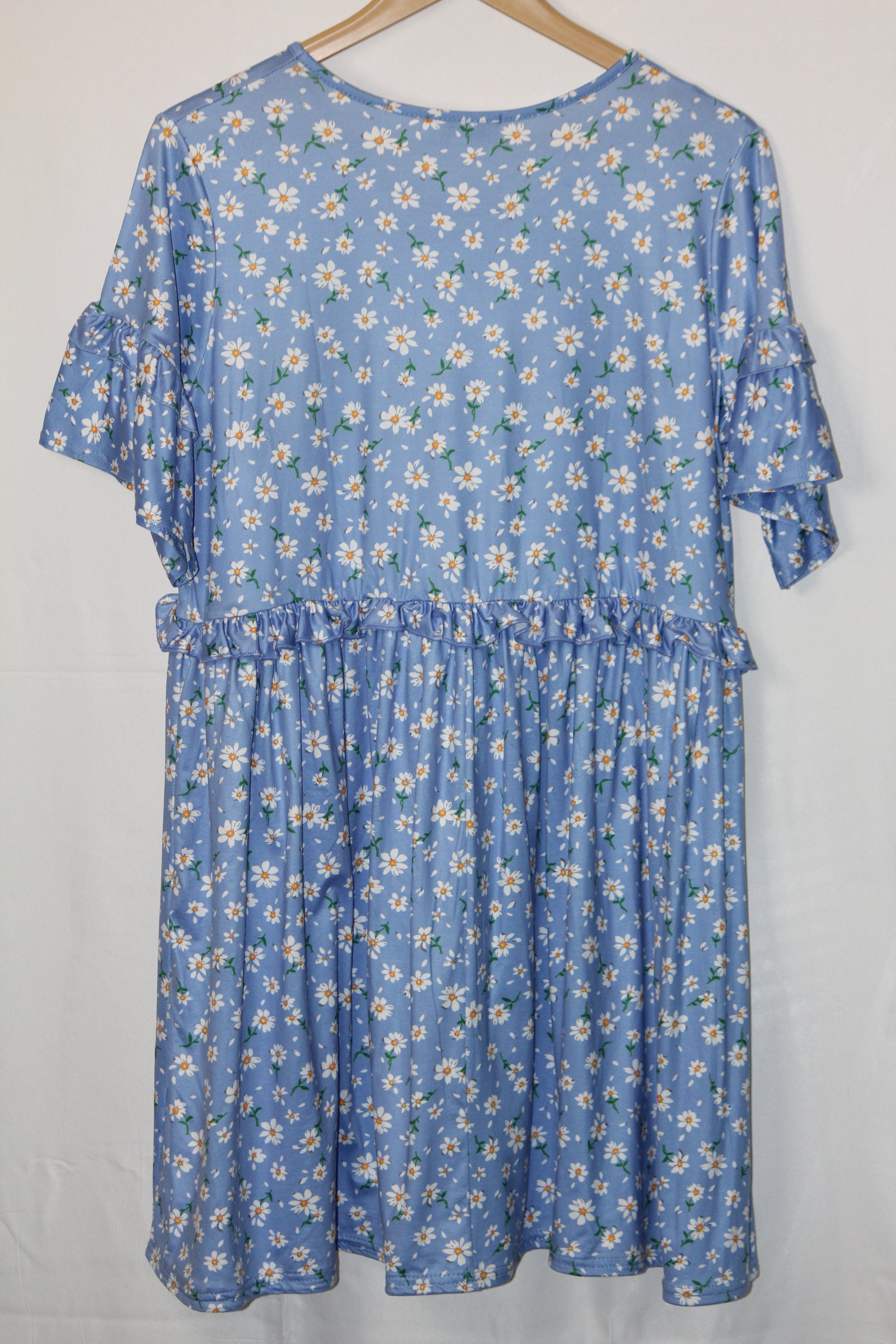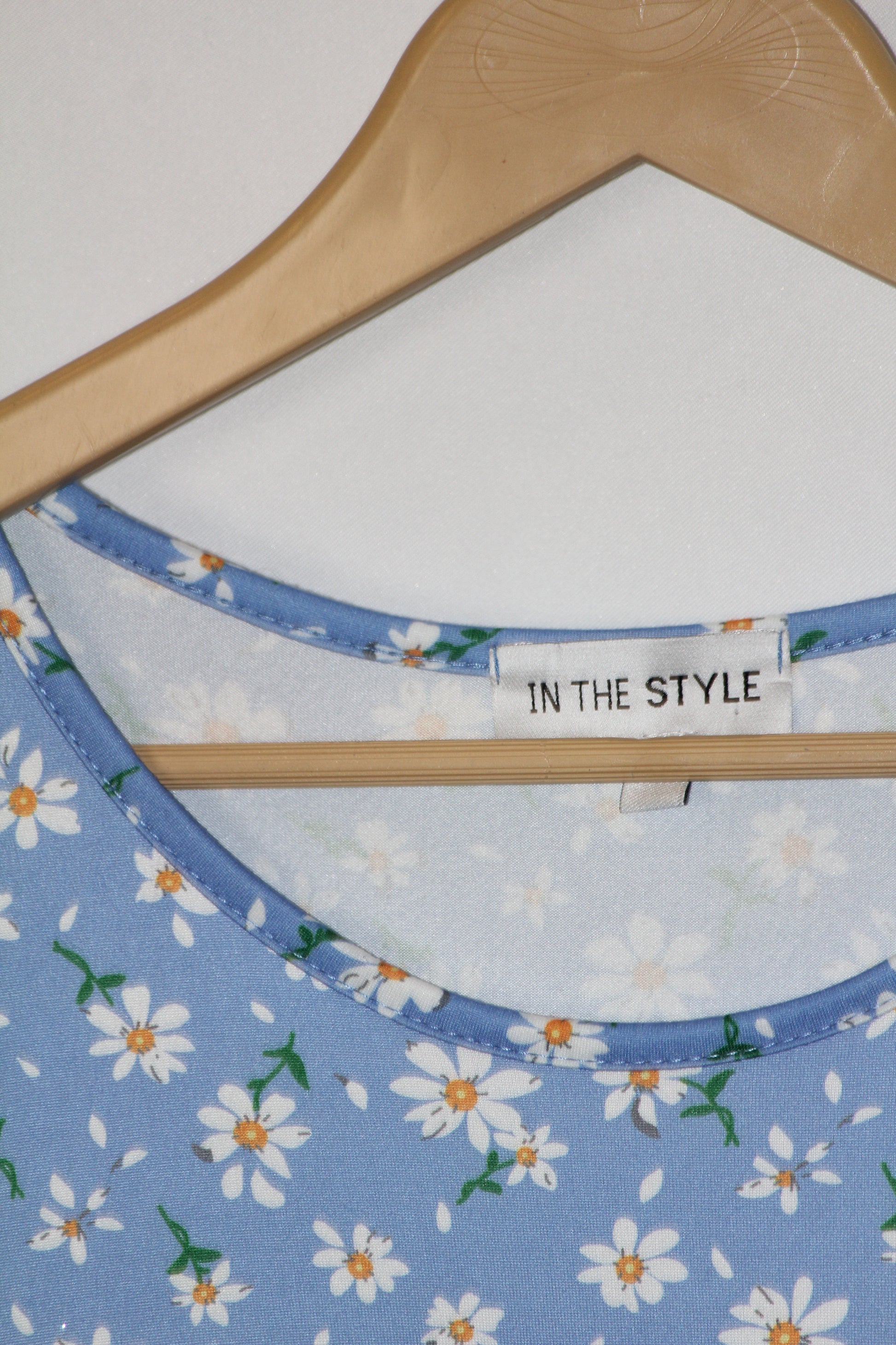 Blue half sleeve blouse with white flowers by In The Style in premium condition. Size: Small – Chest 23", Length 34". Fabric: 95% Polyester, 5% Elastane.