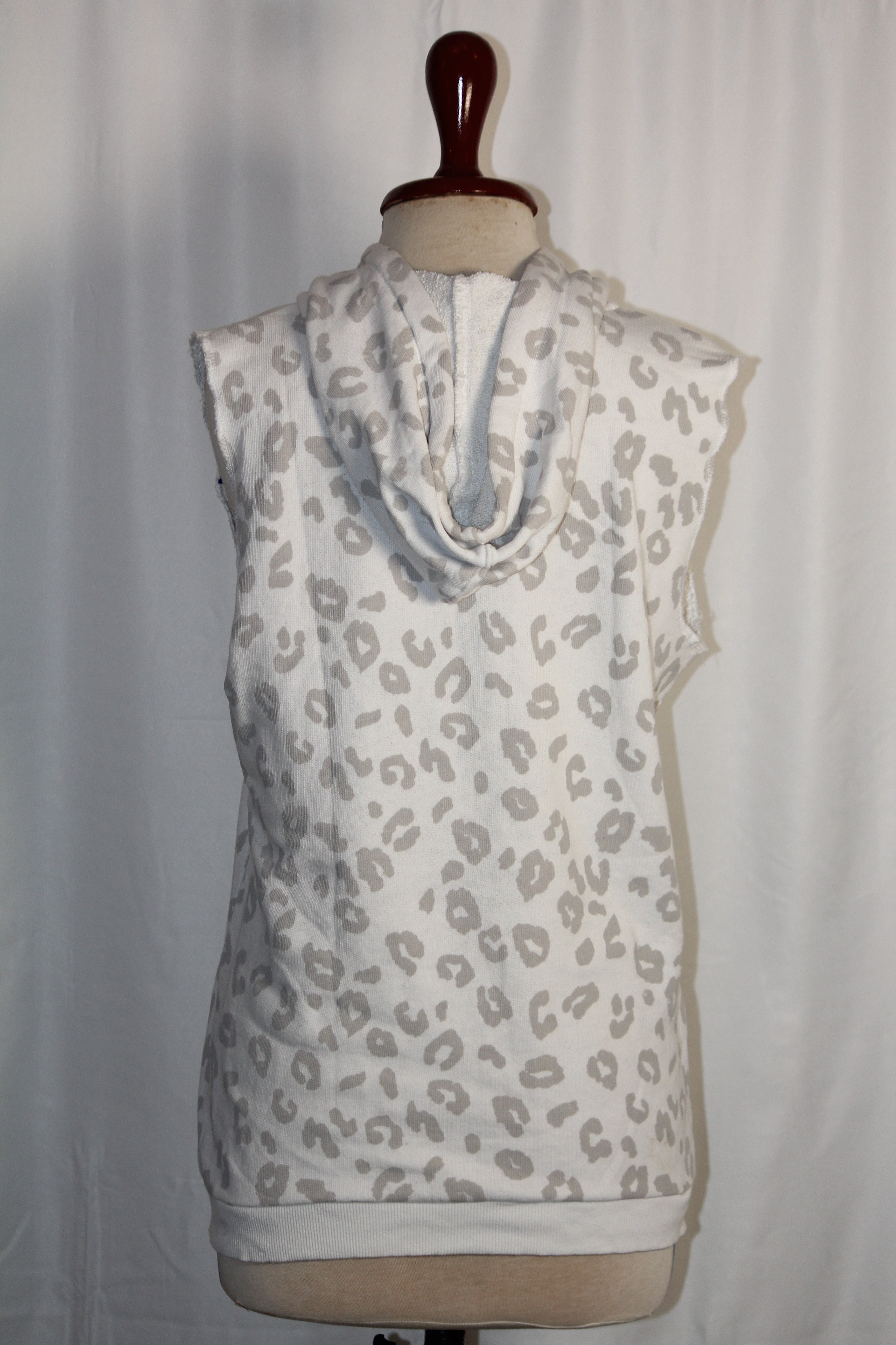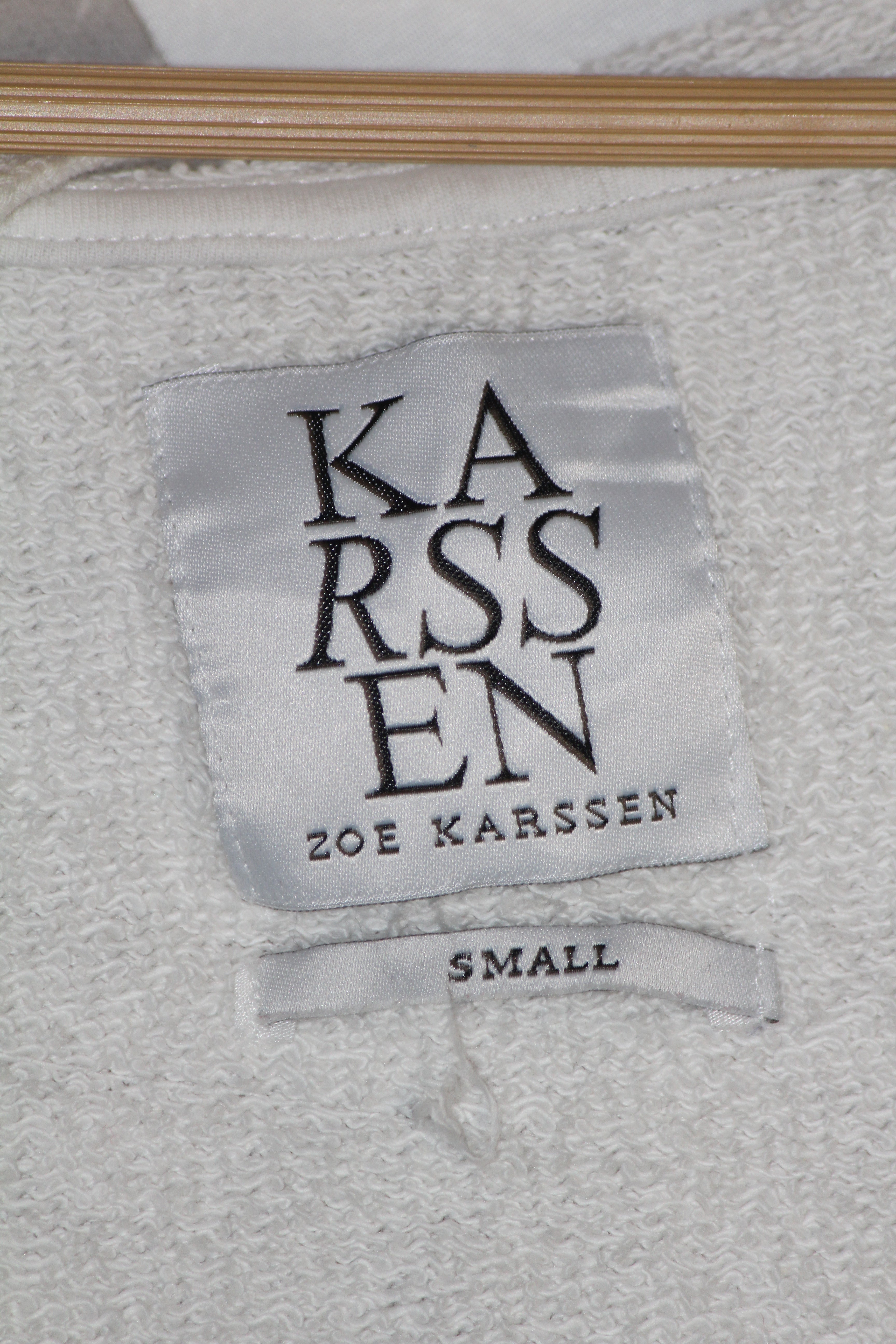 This white and grey hoodie from Karssen offers a small fit with a 22-inch chest and 29-inch length, creating a unique, sporty style.