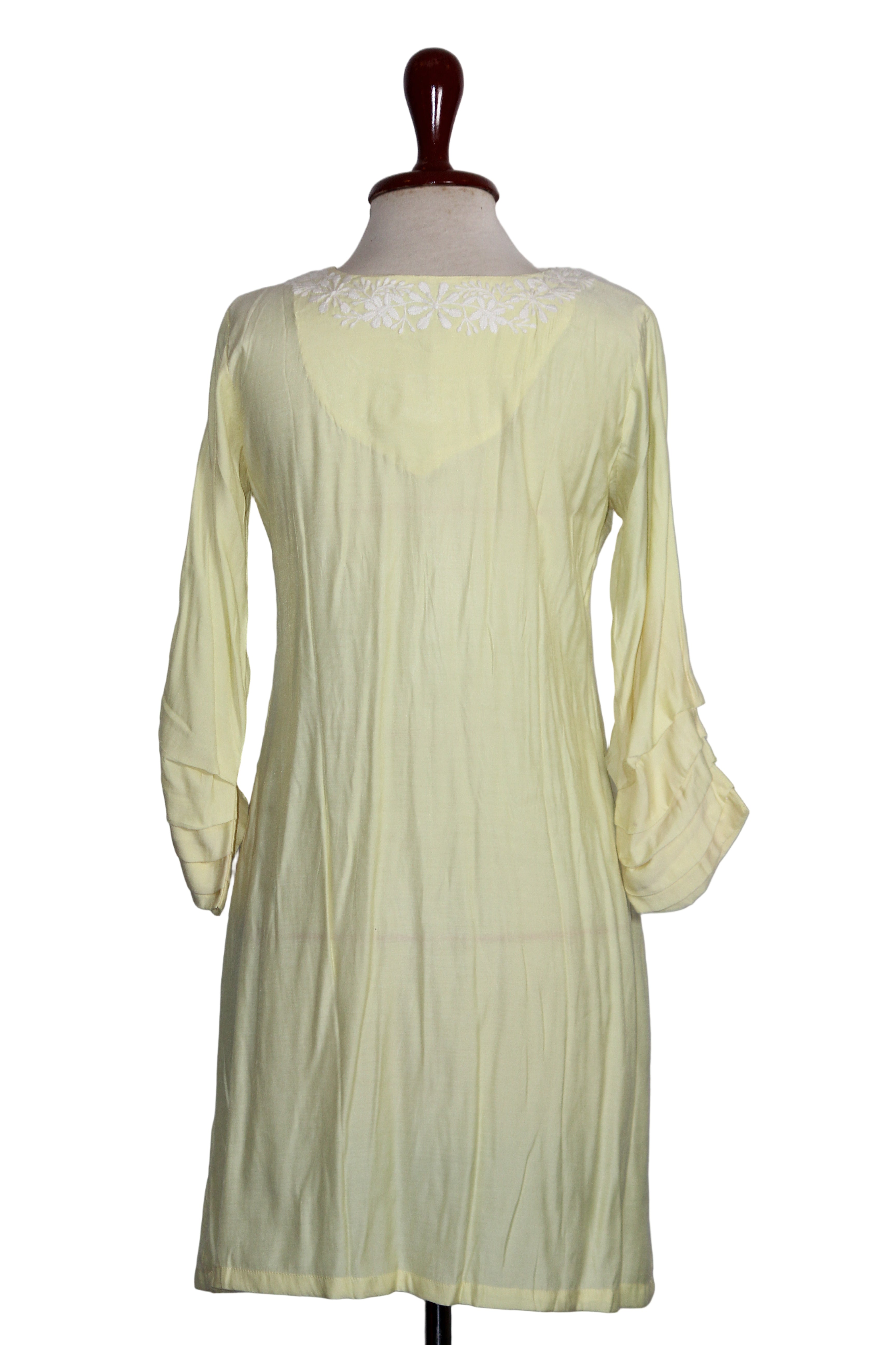 Full sleeve yellow frock style kurti by CLF. Size: Small (Chest: 19", Length: 36", Sleeve: 18"). Fabric: 100% Viscose.