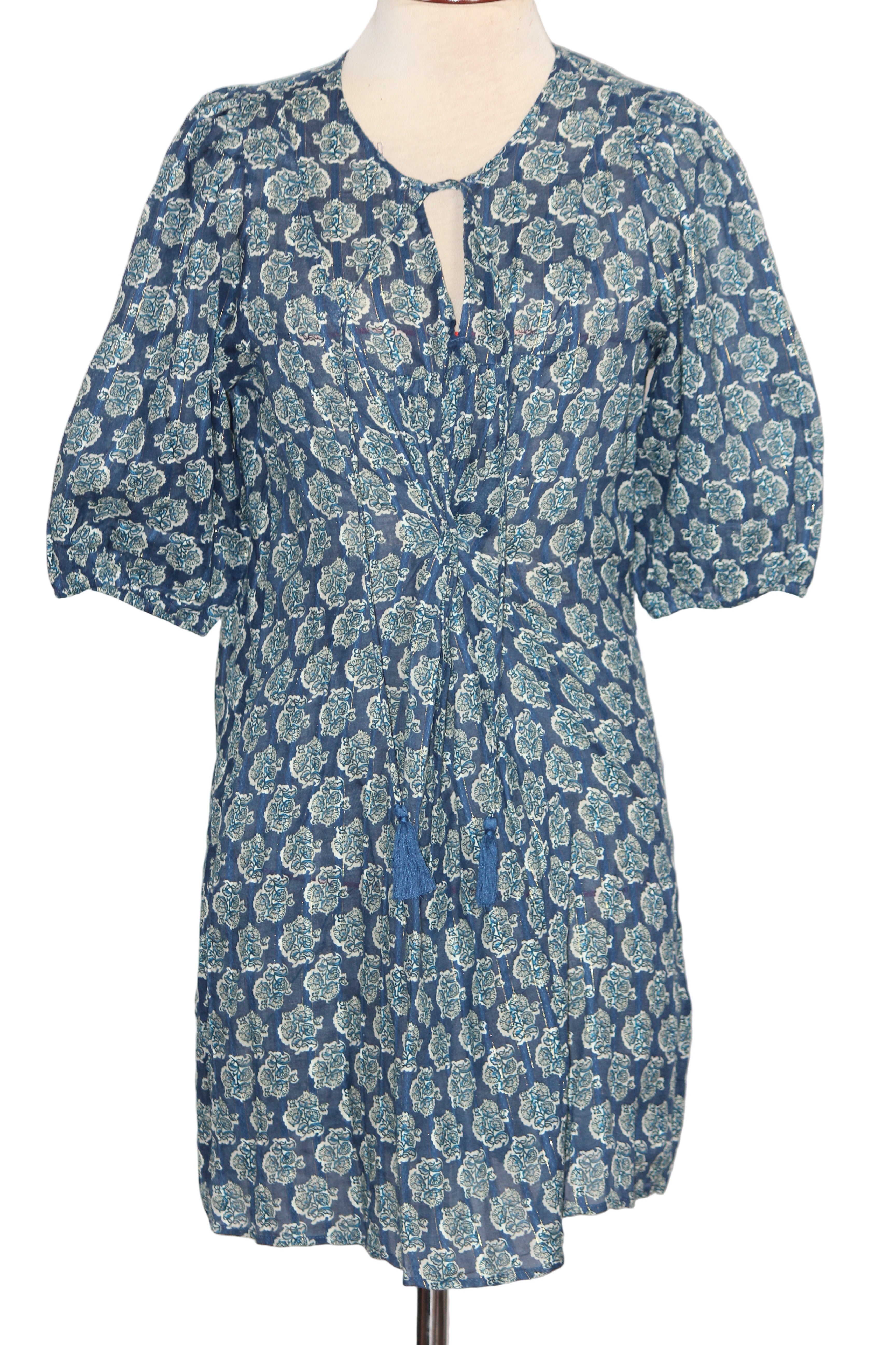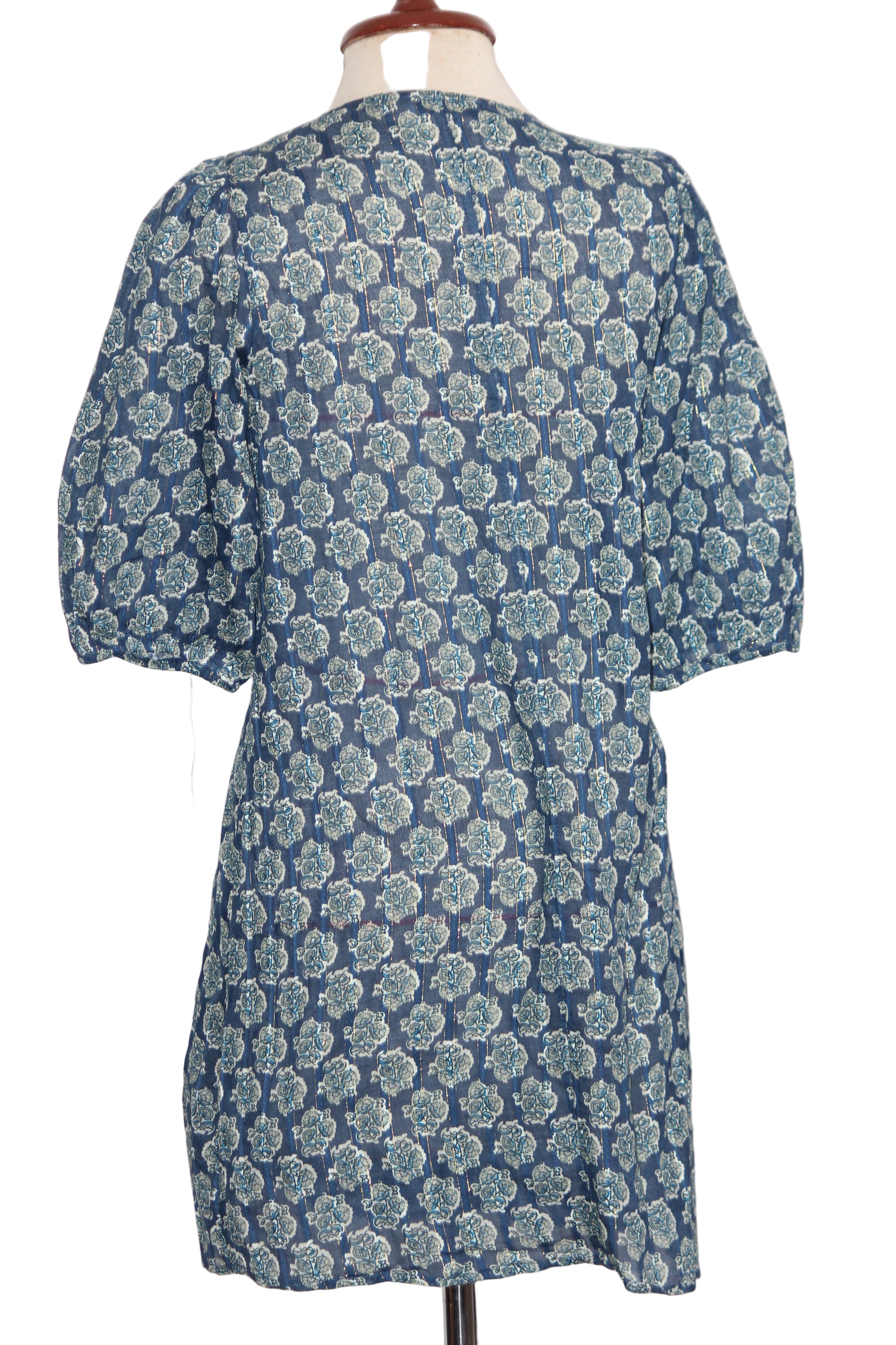 Full sleeve blue frock style kurti by Papaya. Size: Small (Chest: 18", Length: 32", Sleeve: 16"). Fabric: 99% Cotton, 1% Metallised.