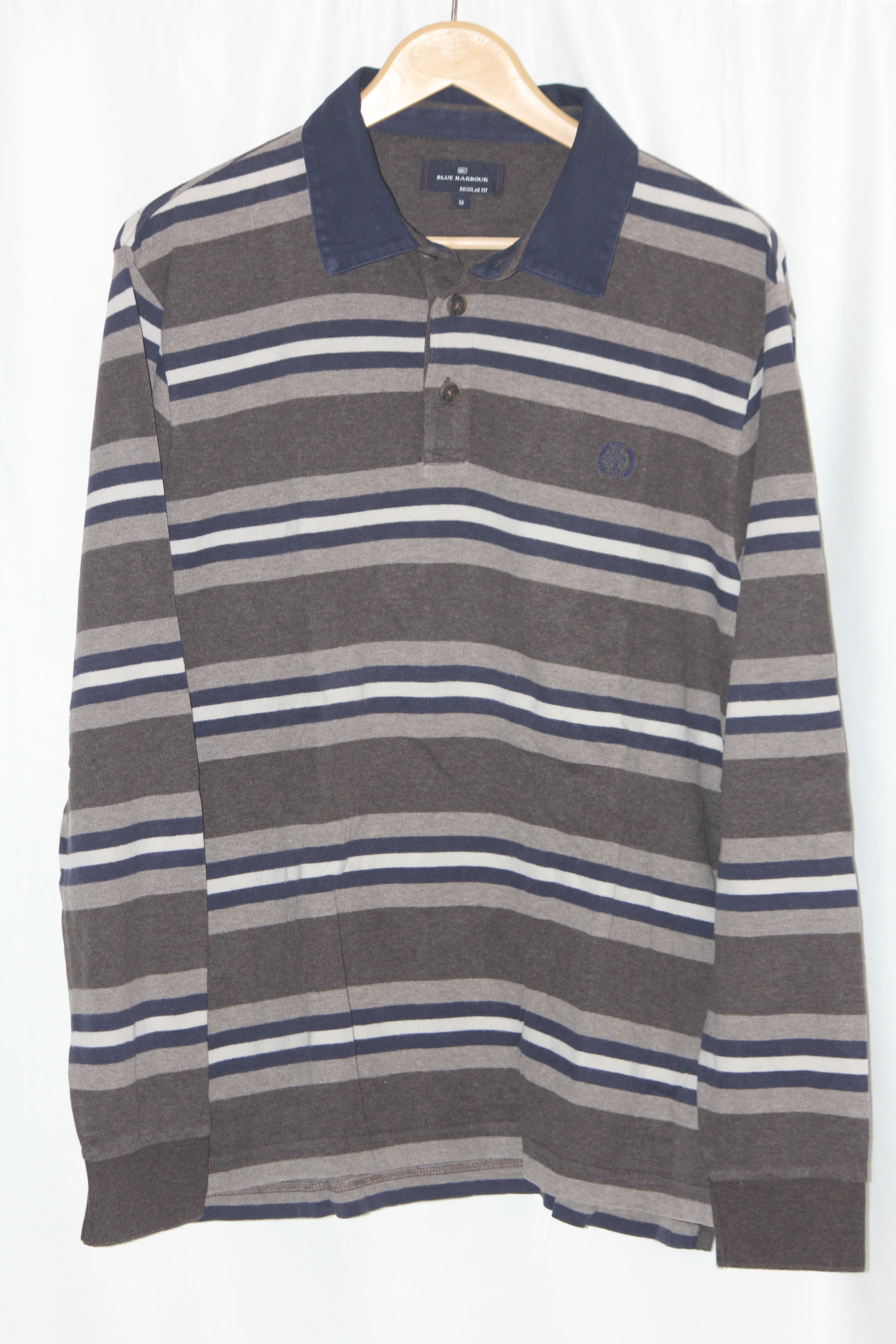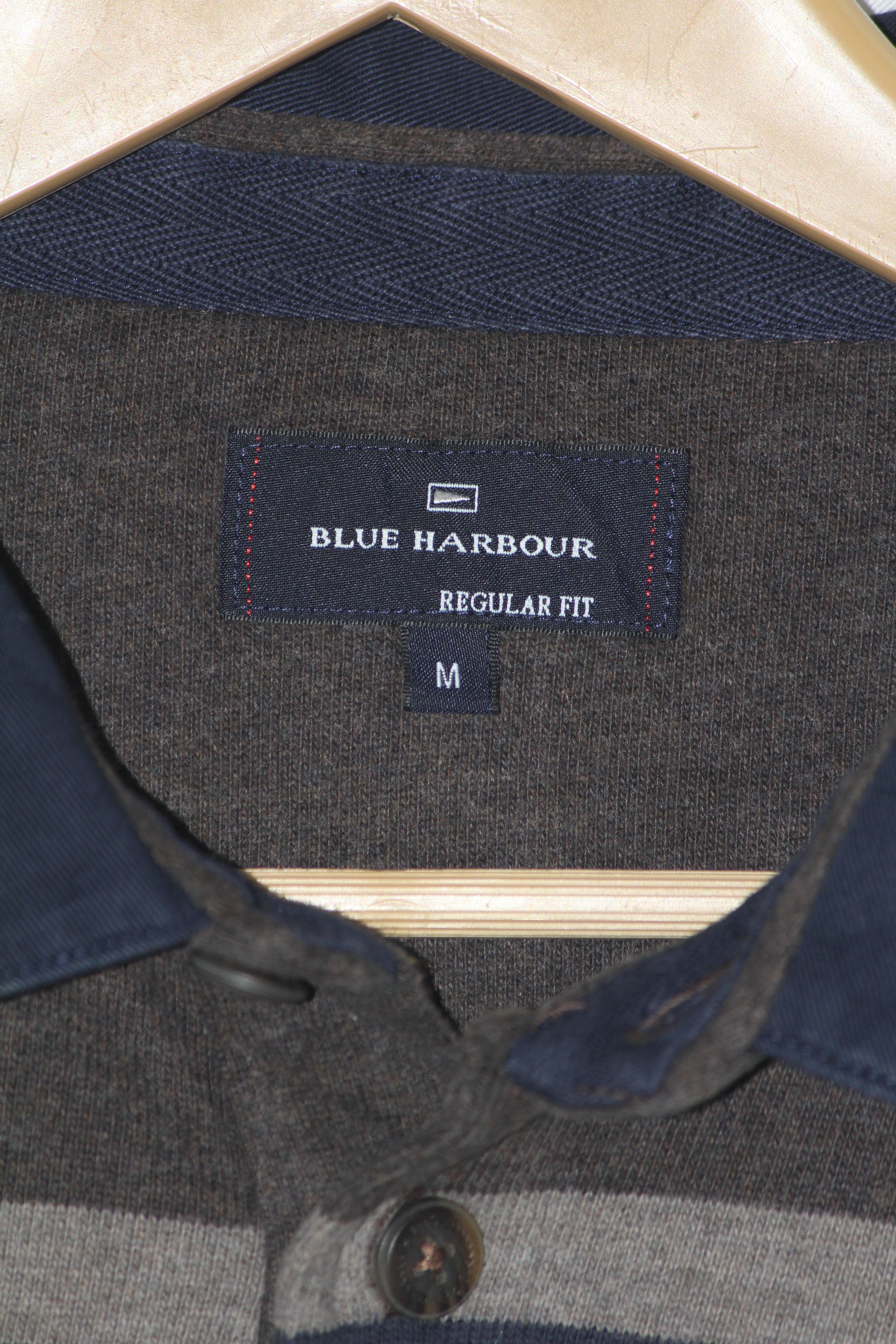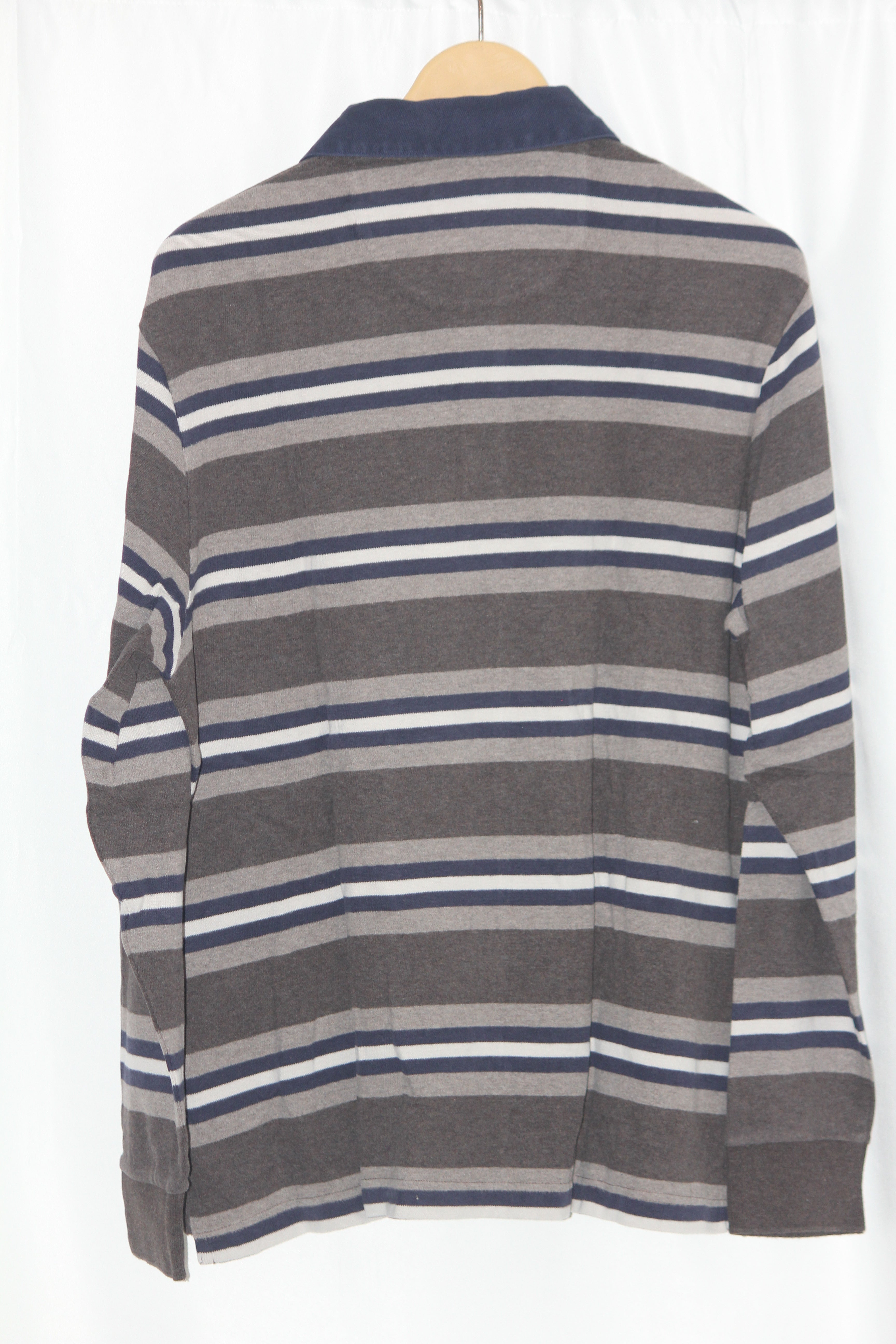Brown full sleeve polo sweatshirt by Marks & Spencer with white stripes. Chest 23", Length 28", Sleeve 26", Collar 18". Fabric: 100% Cotton.