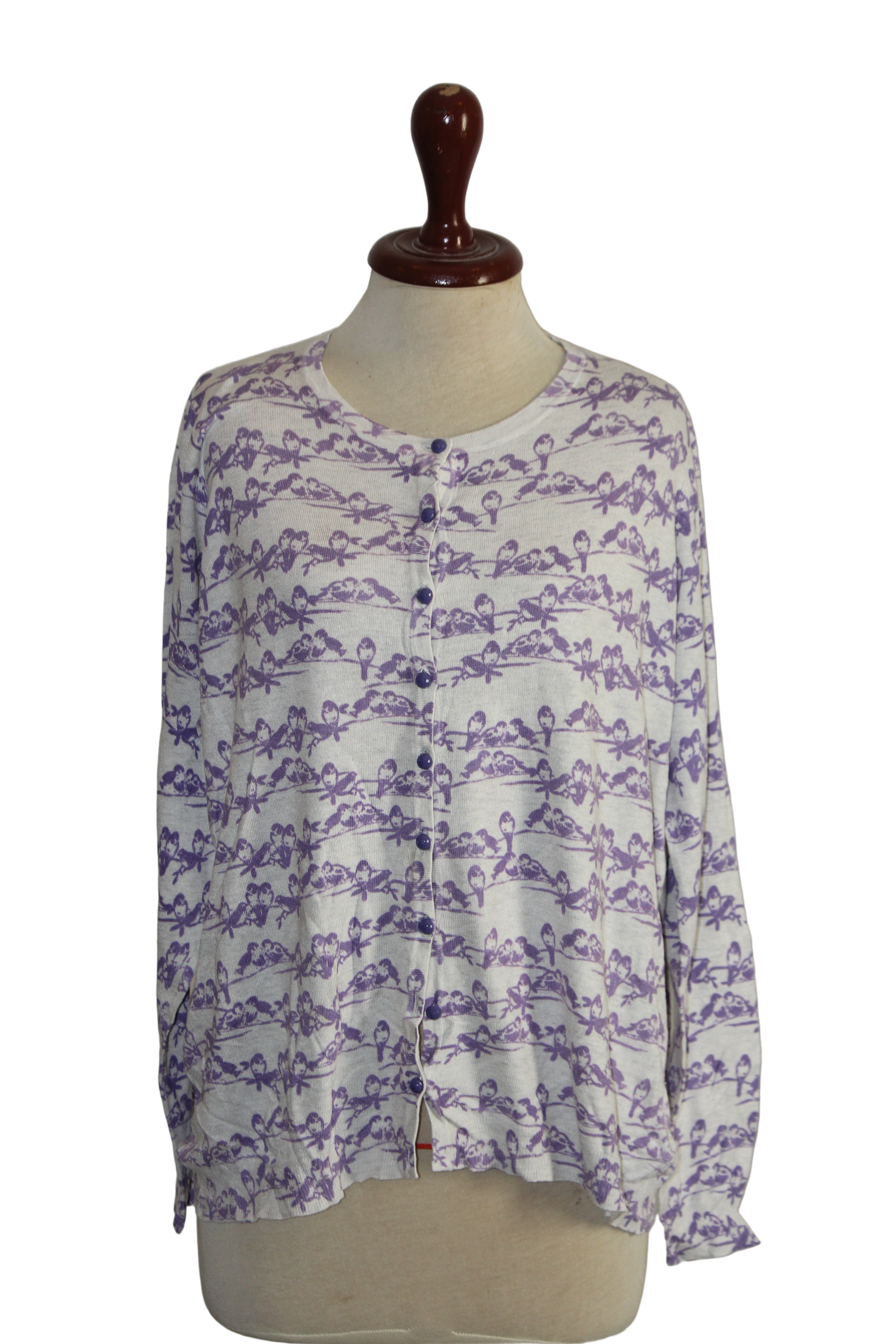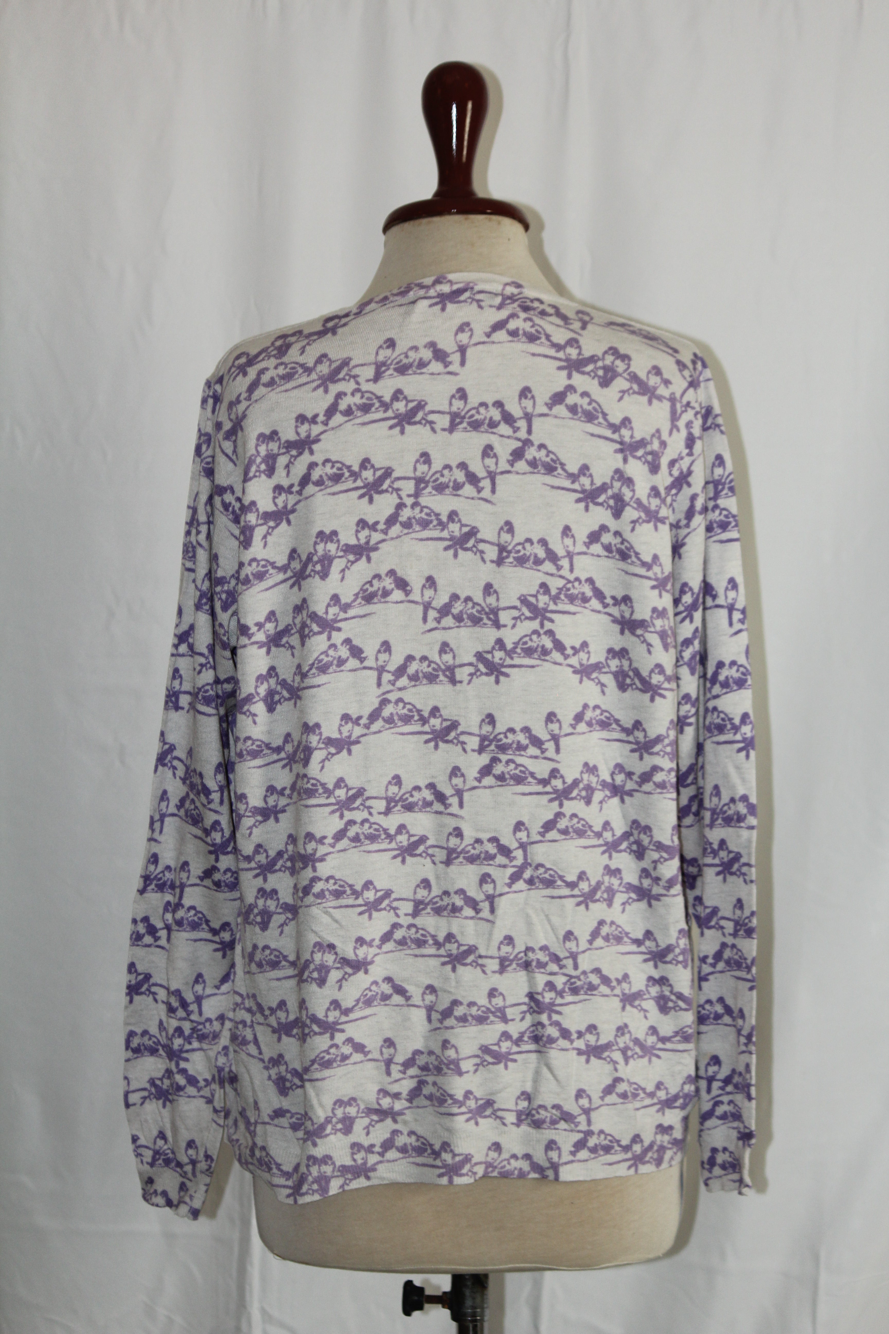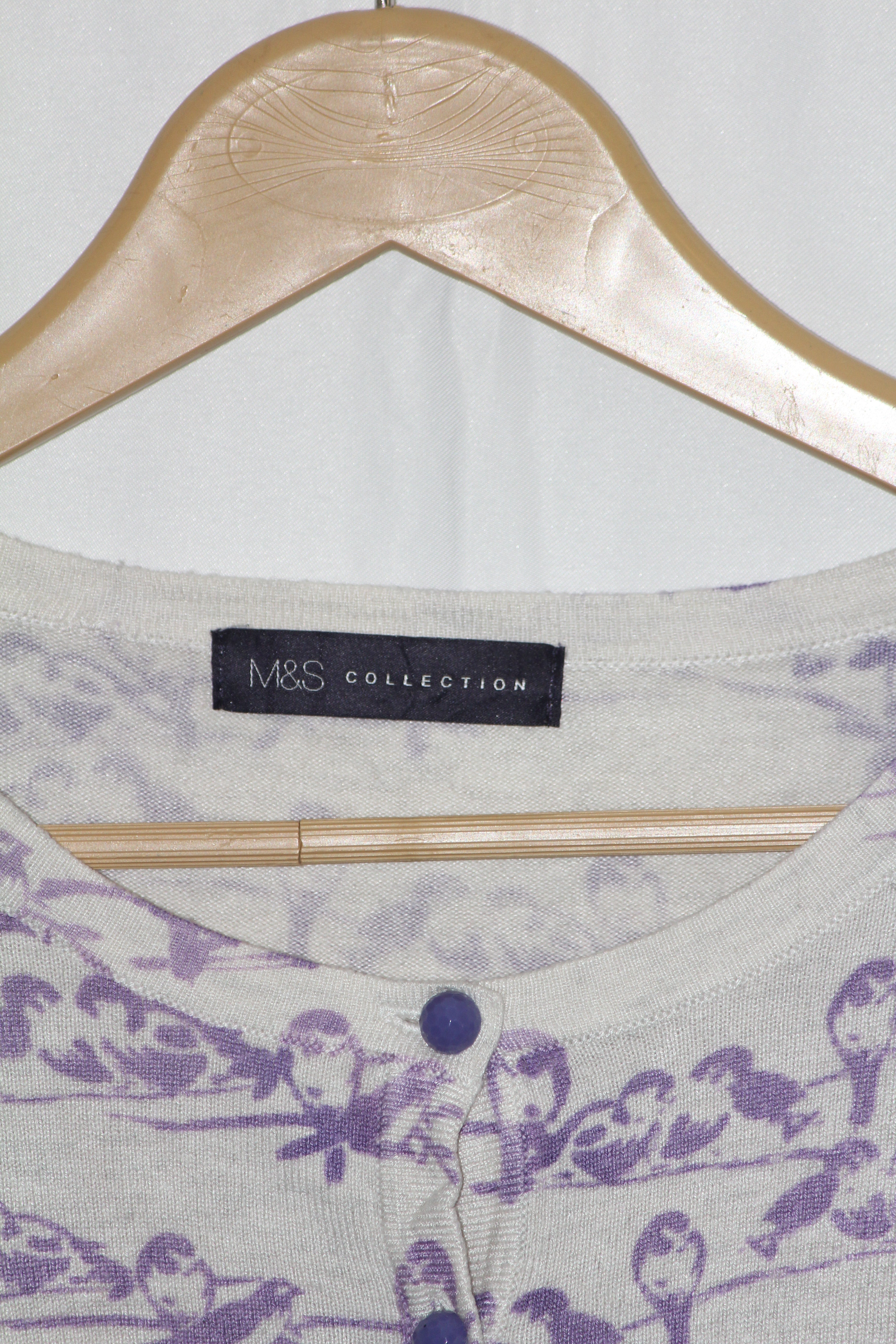 Stay stylish with this M&S large white viscose sweater featuring a beautiful purple bird print, ideal for a casual or semi-formal occasion.