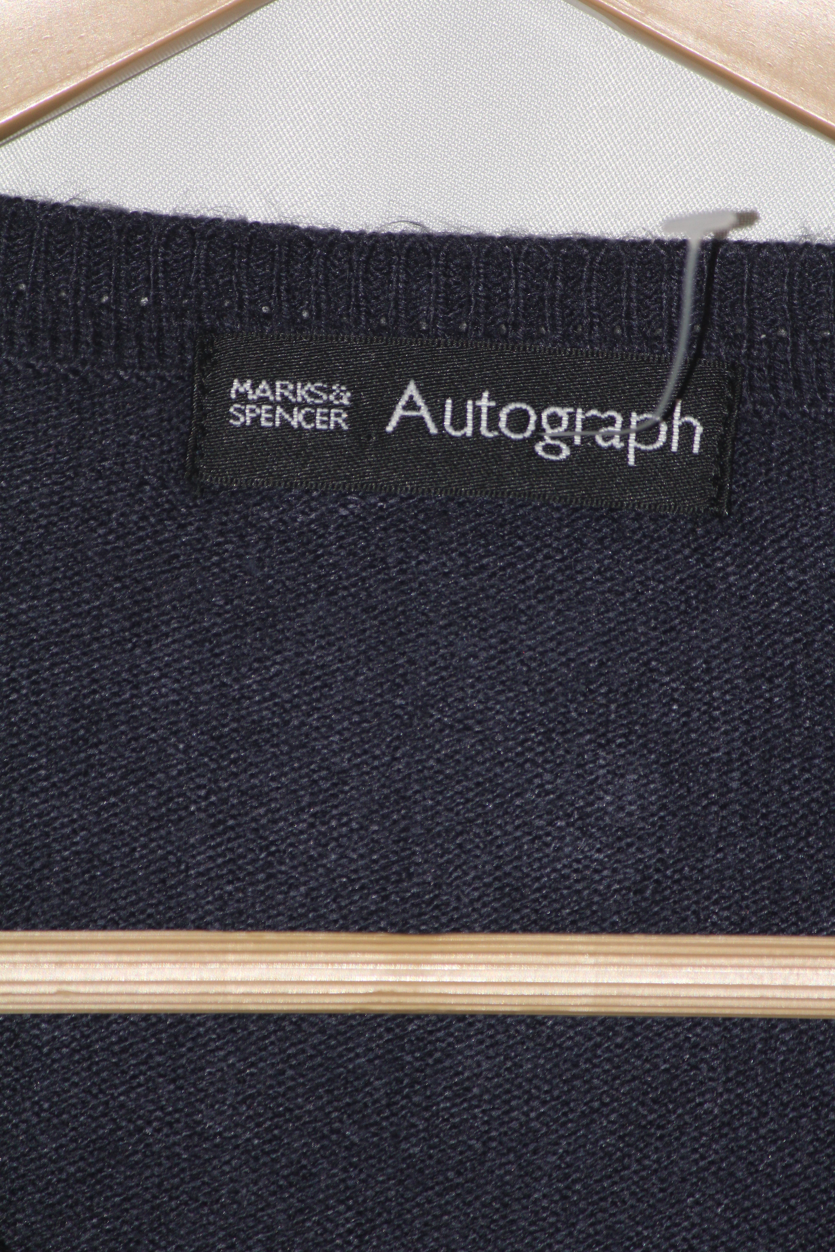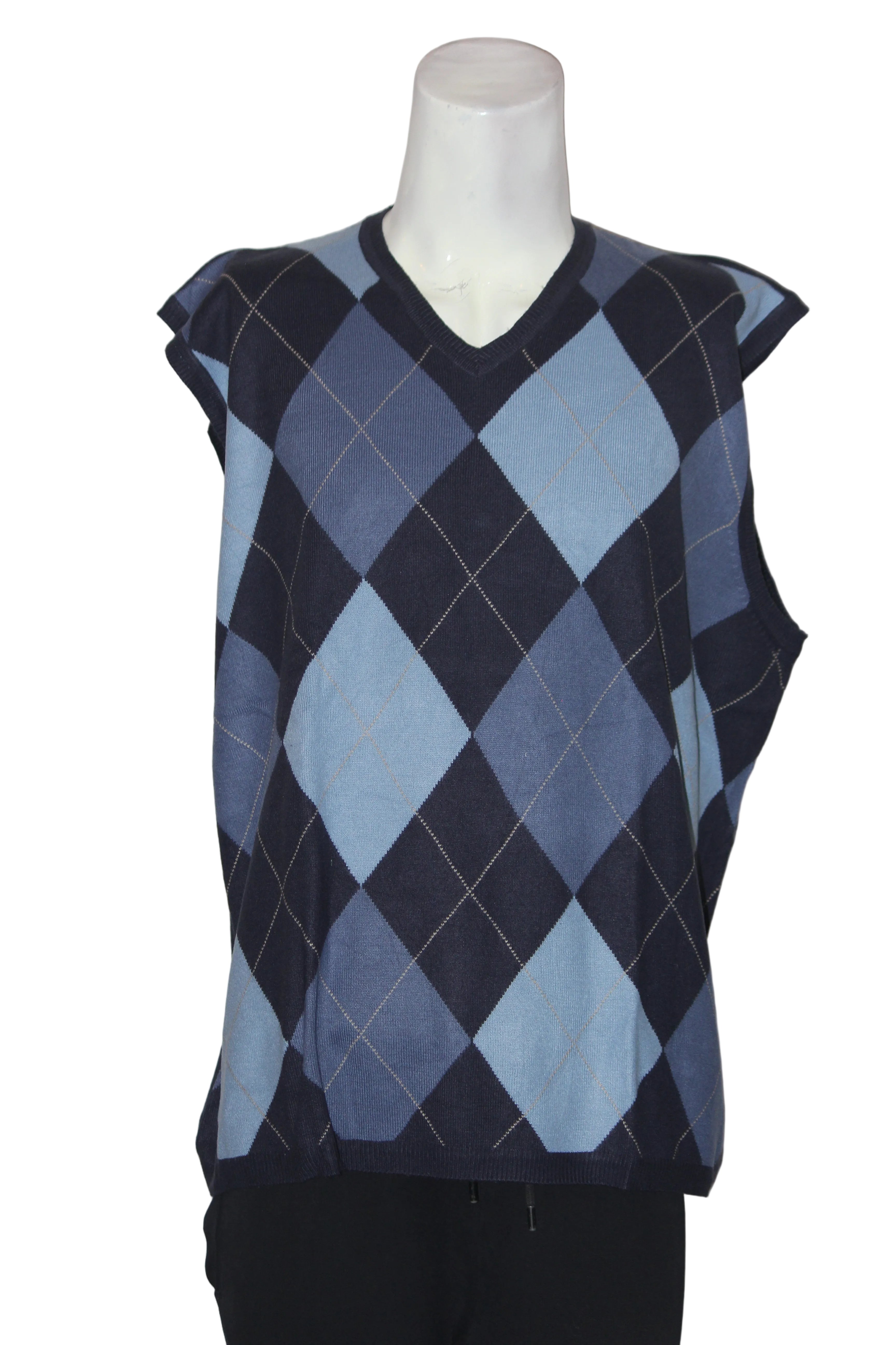 Elegant sleeveless navy blue checkered sweater by Marks & Spencer. Chest: 27", Length: 29". Made from 100% acrylic, lightweight and smart look.