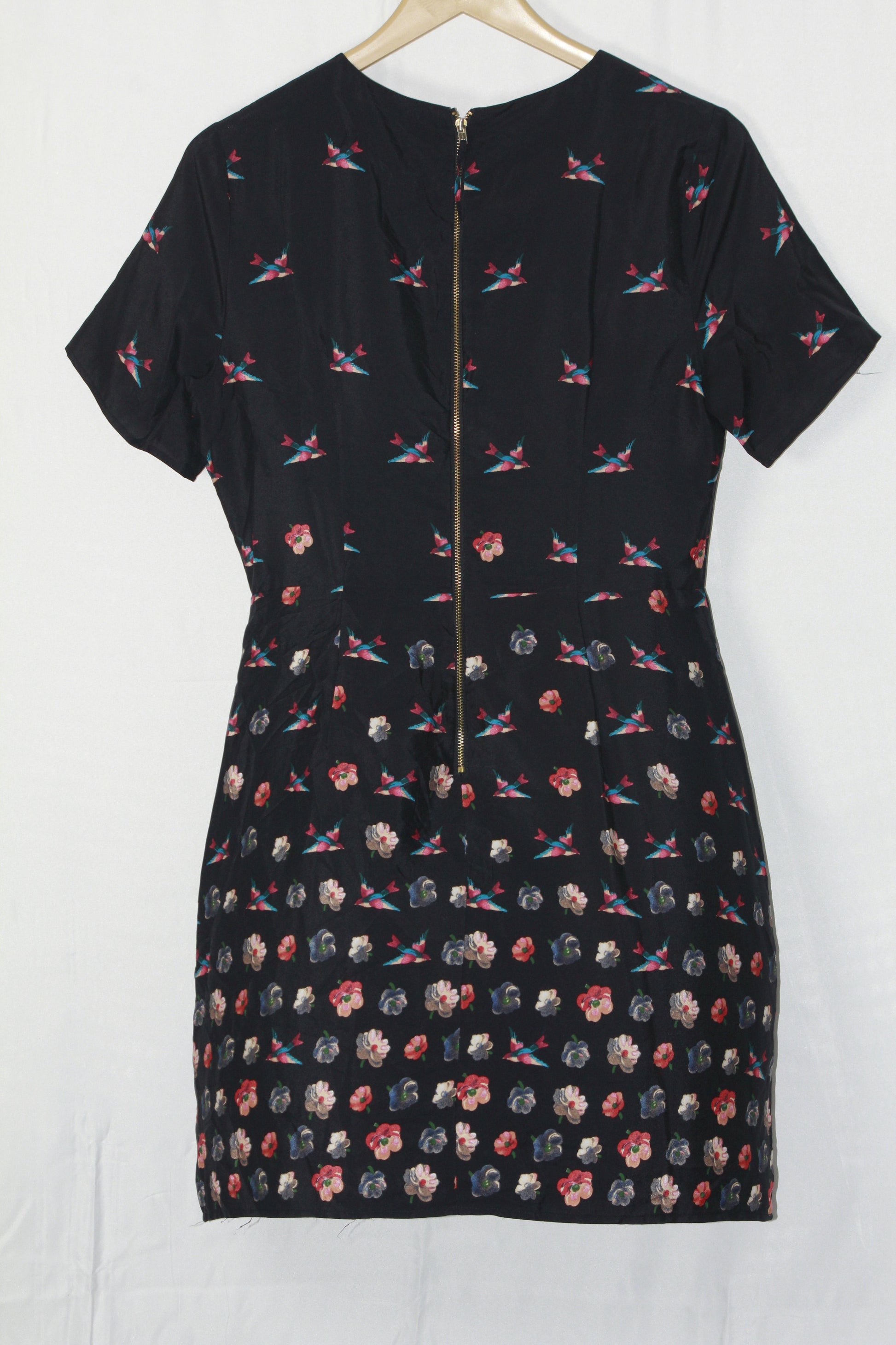 - A stunning black half-sleeve dress with a birds and flower print."Size: Medium