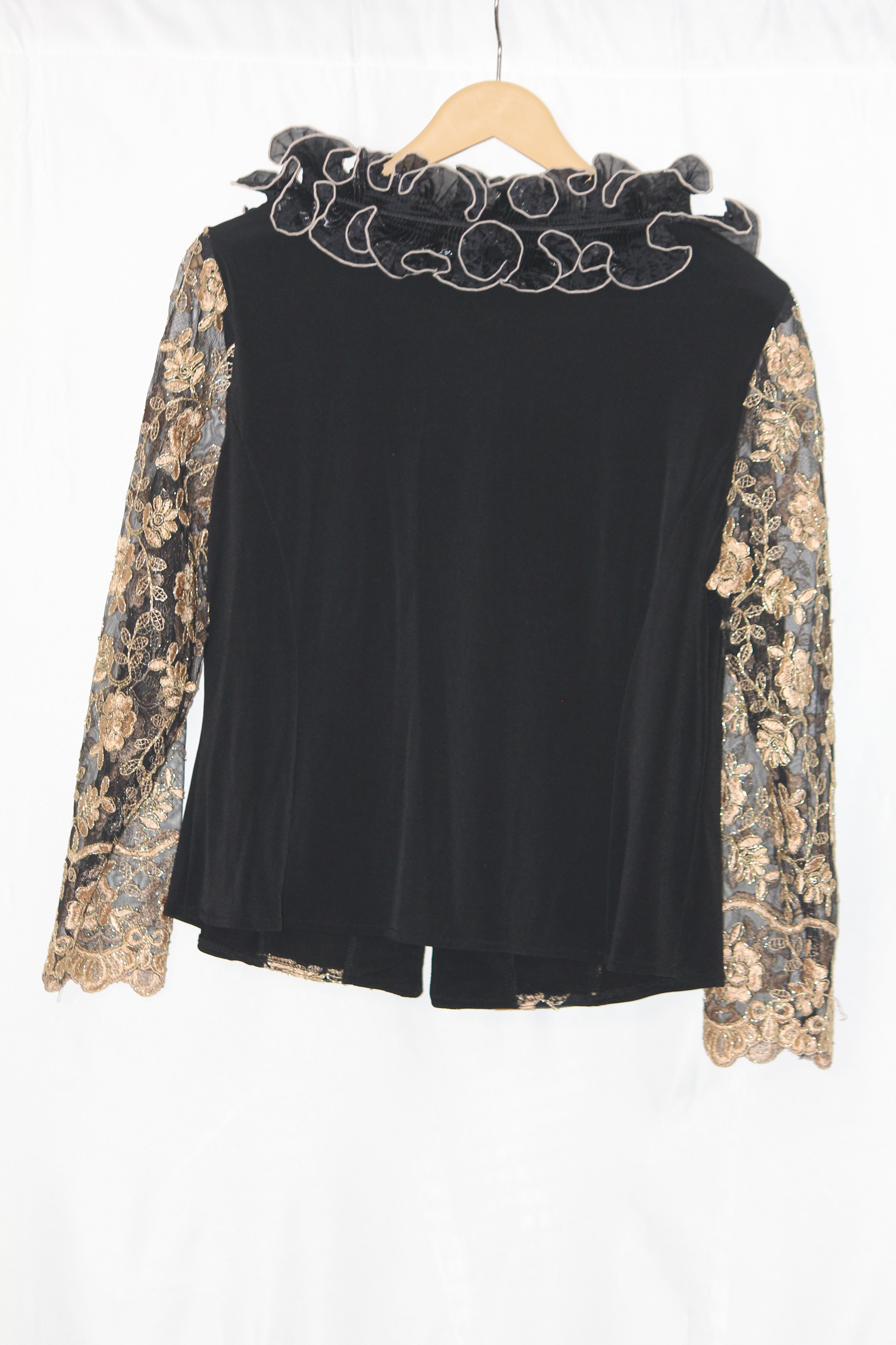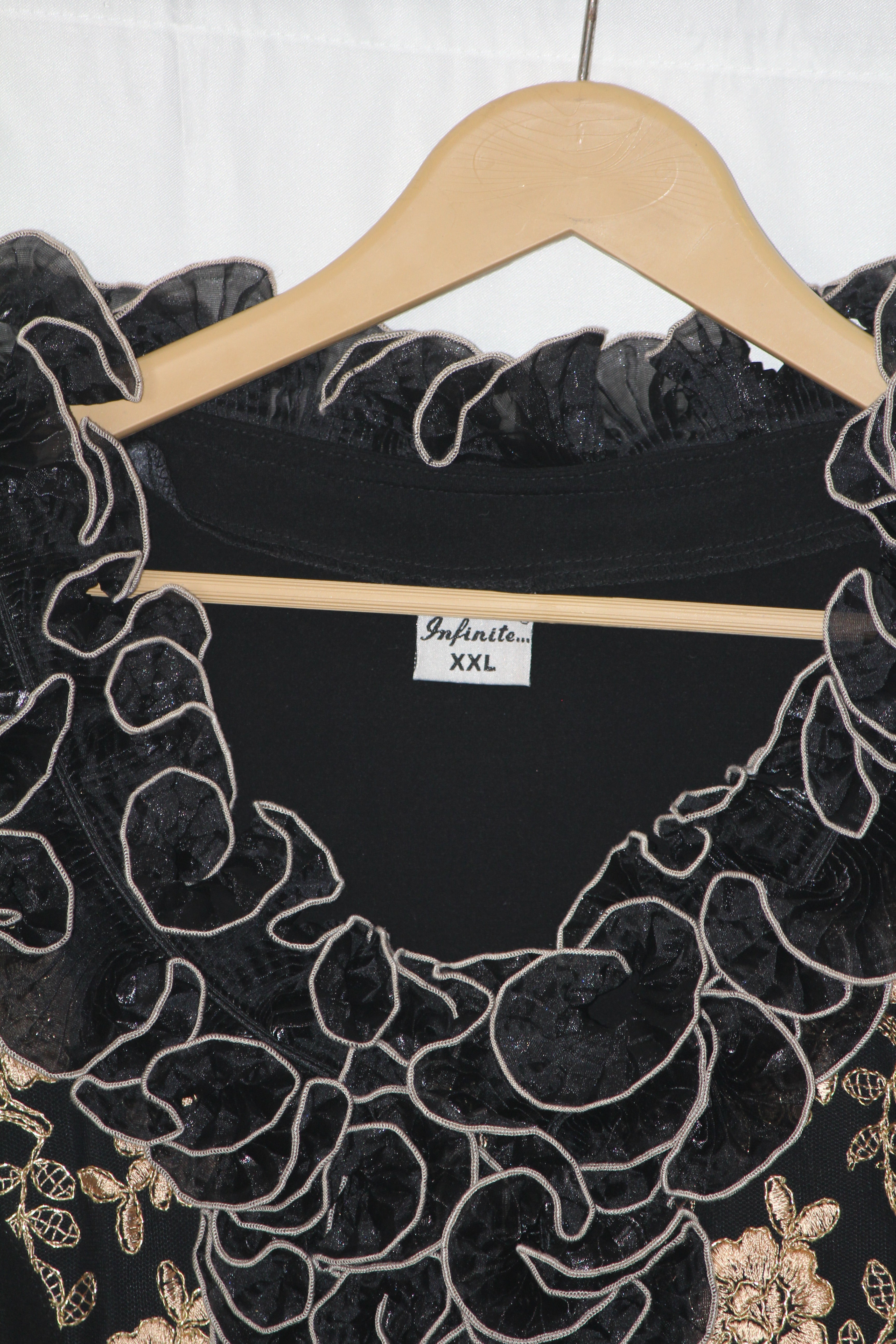 Full-sleeve black blouse with golden floral embroidery by Infinity.