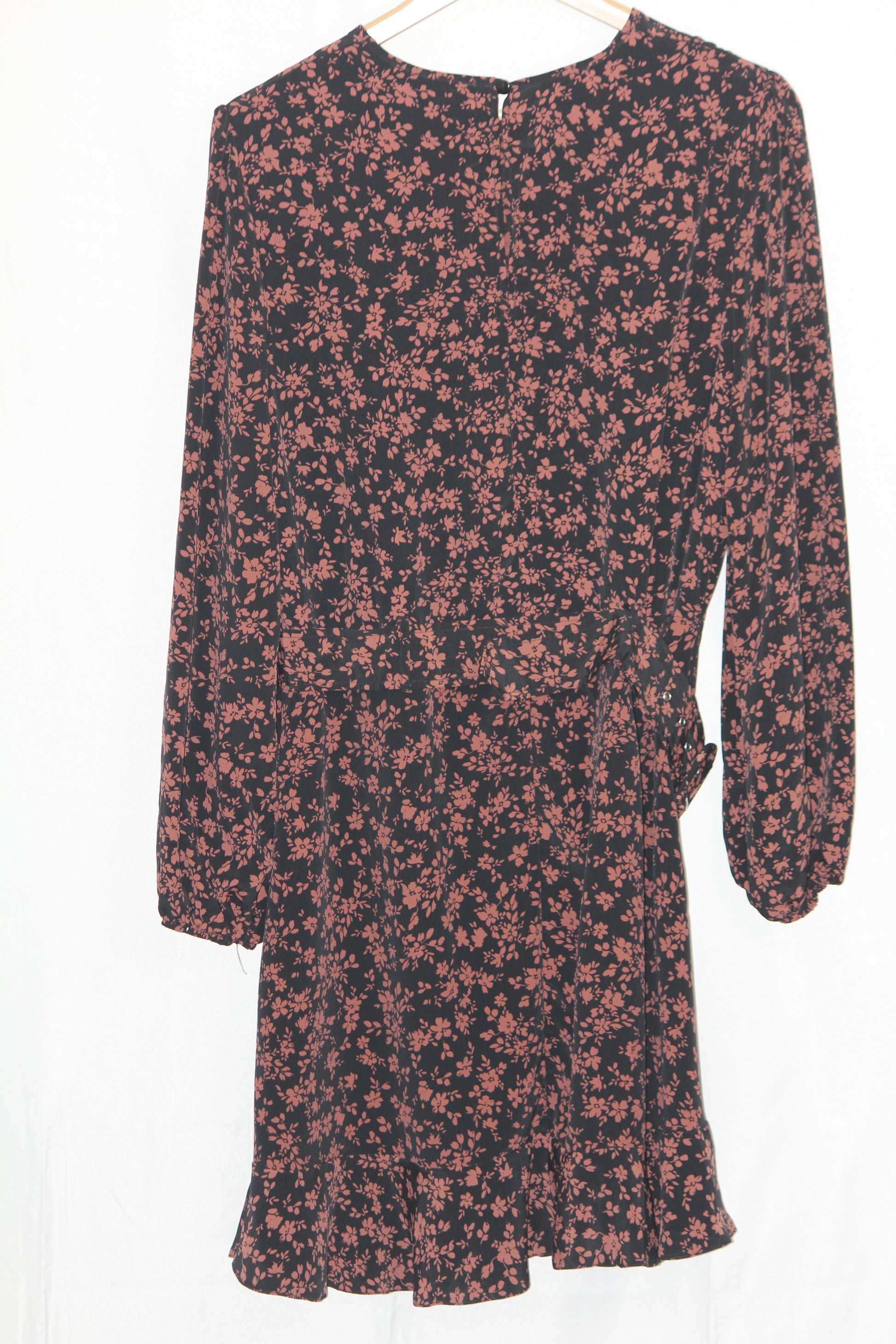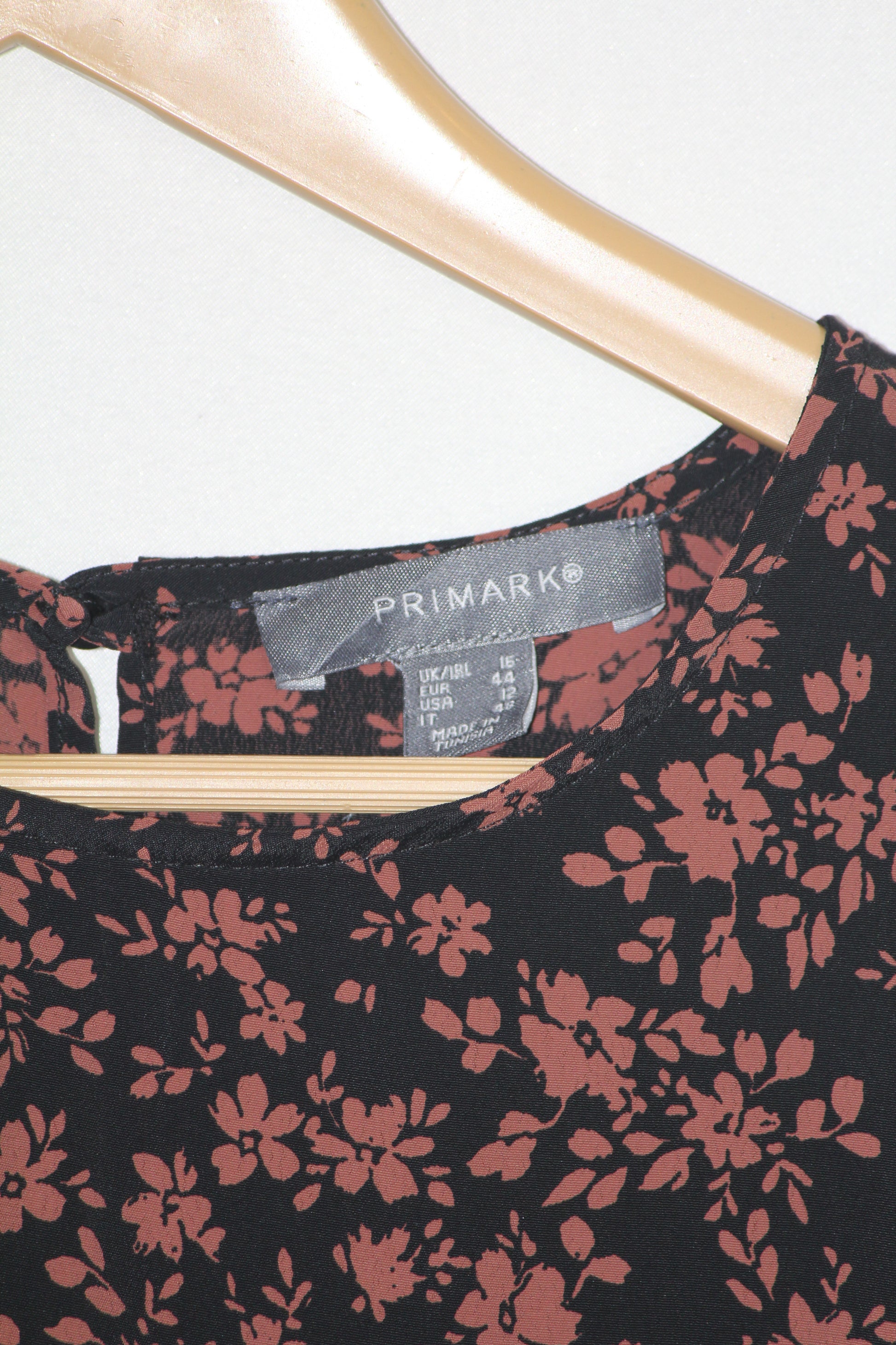 Black dress with brown floral print by Primark. Polyester fabric, round collar, and matching belt at the waist. Large size with chest 20", length 38", sleeve 22". Excellent condition.