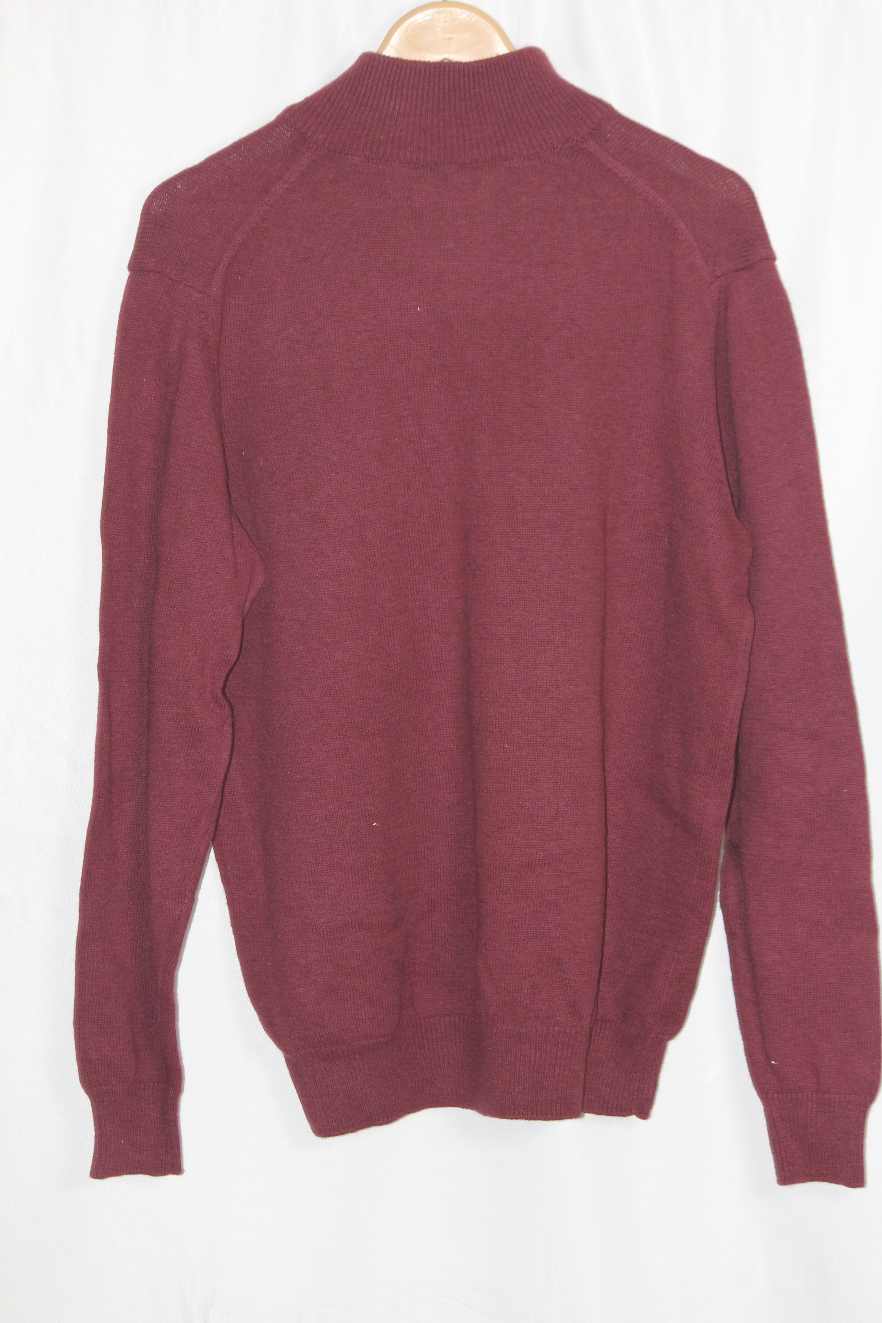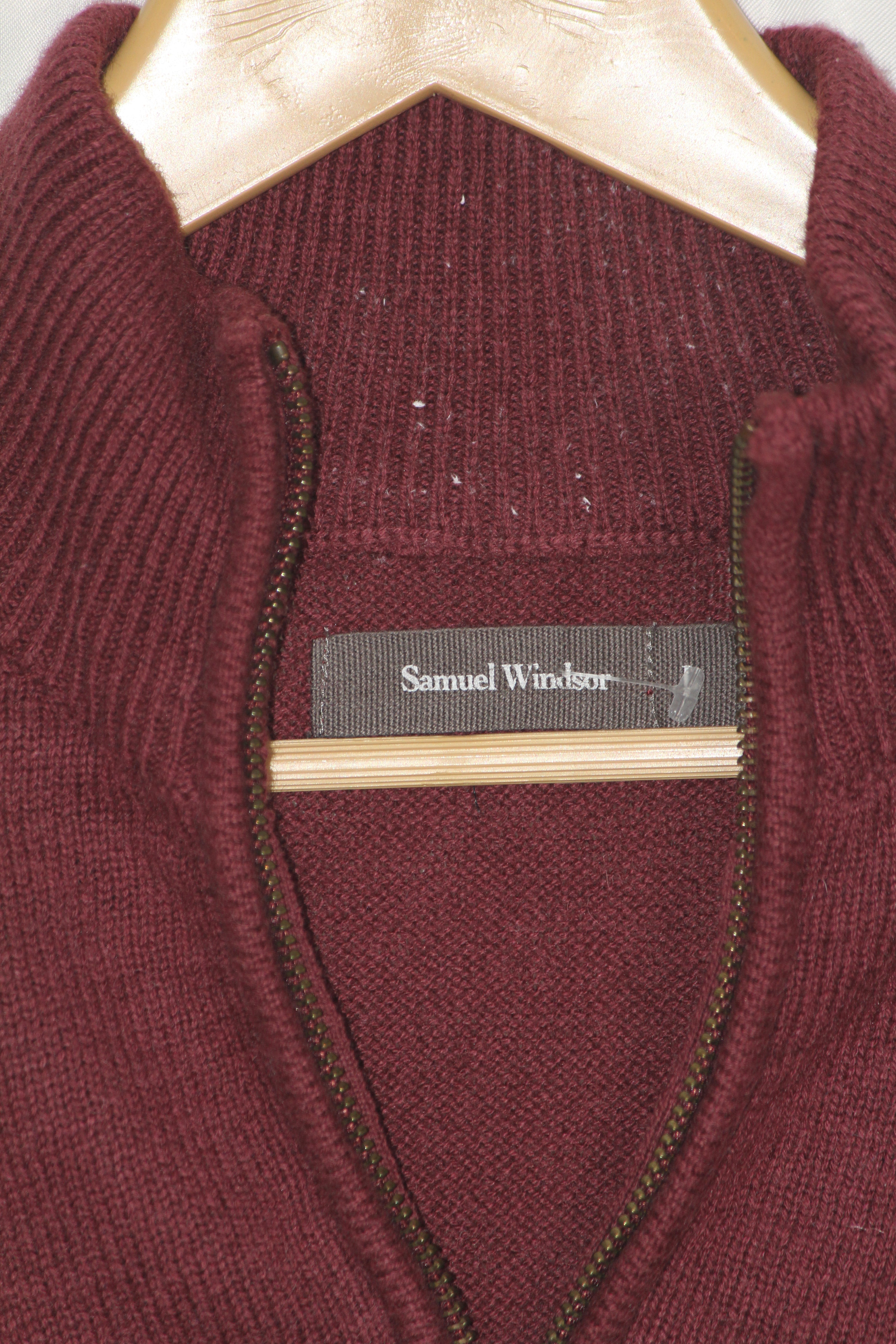 Maroon zip neck sweater by Samuel Windsor. Chest 25", Length 29", Sleeve 29". Fabric: 50% Cotton, 50% Wool.