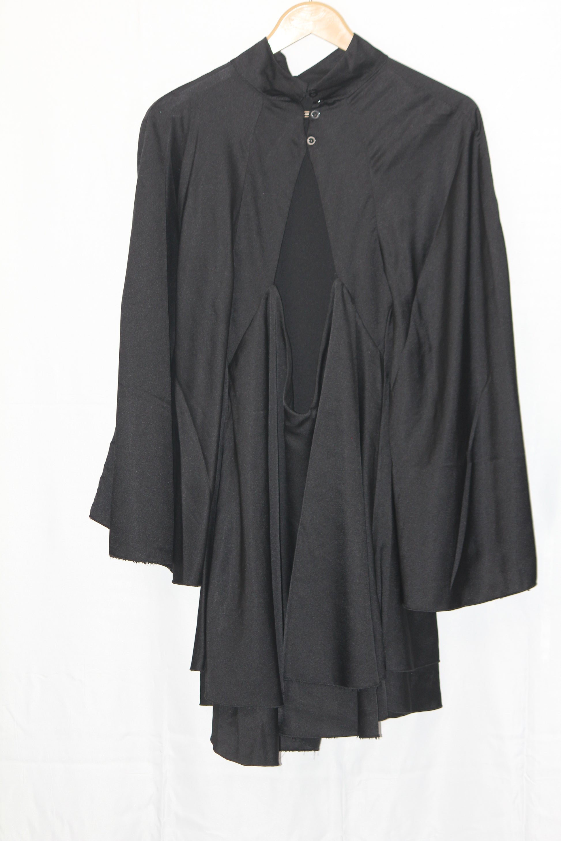 Shiny silk black blouse with buttoned collar, flutter sleeves, and front slit. Silk-polyester mix. Size Large with Chest 19–20", Length 31–32", Sleeve 27".